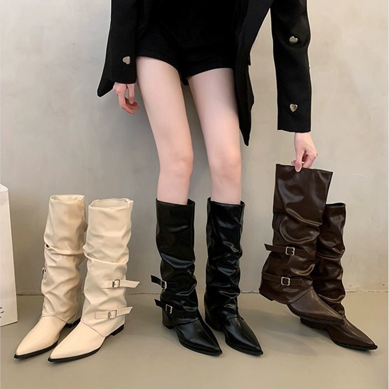 Высокие ботинки с толстым каблуком для женщин, новые весна-осень 2025, ботинки с острым носом, длинные ботинки, ботинки для брюк, рыцарские ботинки