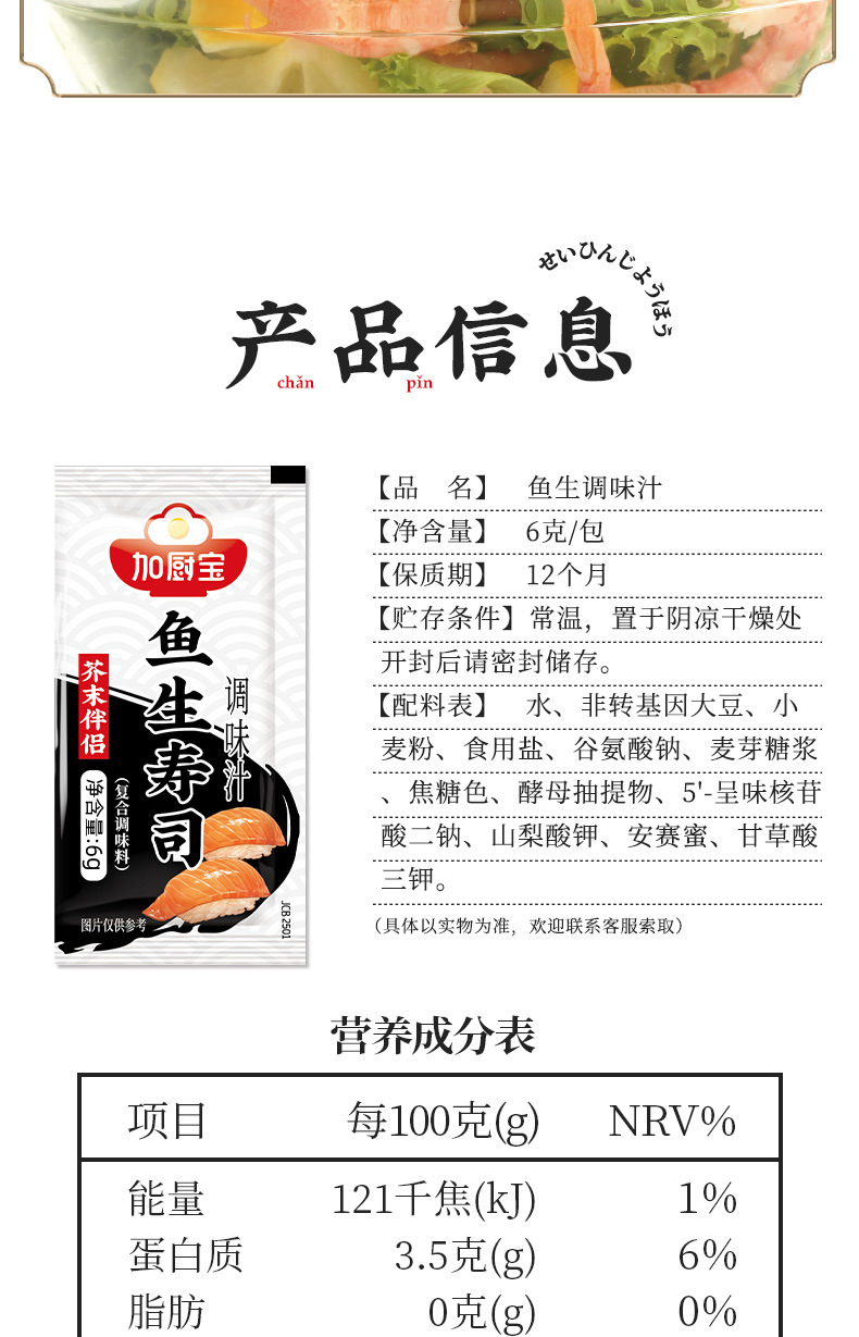 ![]() | Yu sheng sushi sauce 6g | 15шт: ¥0.30, 1000шт: ¥0.25, 10000шт: ¥0.24 | 9757 | 6114747022484 |
