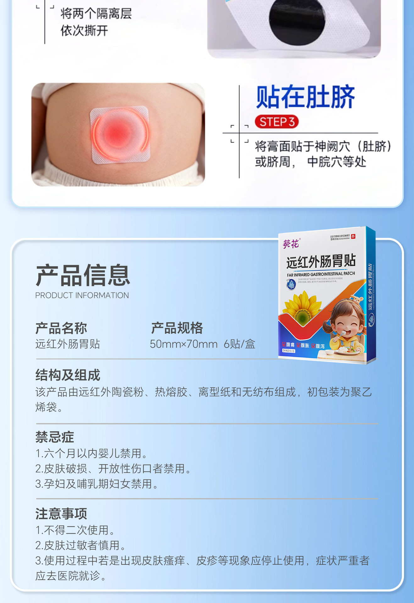 Функция This product is suitable for acupuncture point application in traditional chinese medicine. it plays an auxiliary treatment role for the uncomfortable symptoms of abdominal pain, abdominal distension and diarrhea through the principle of far-infrared thermal radiation.