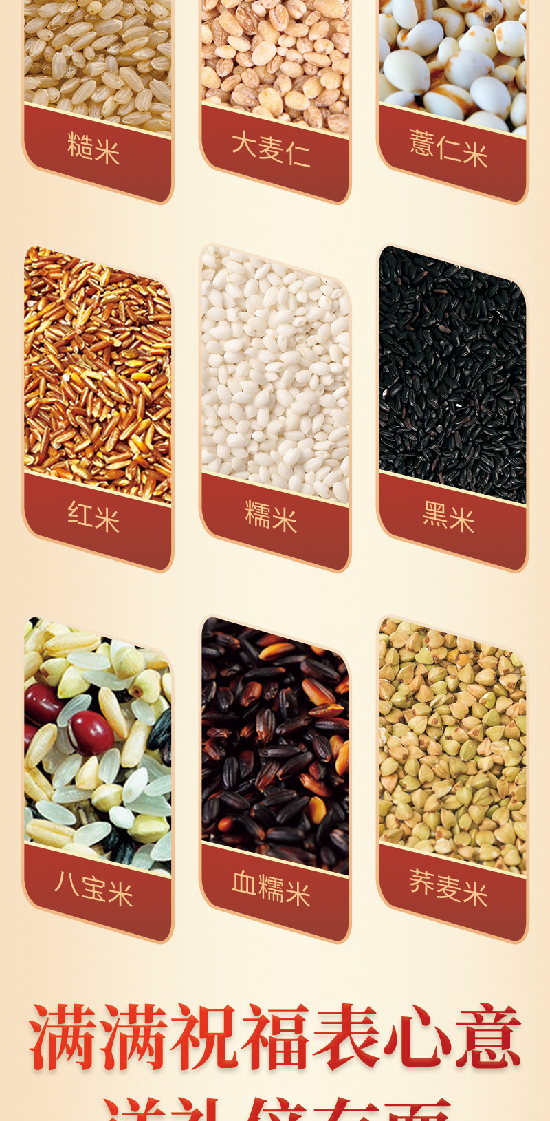 Сырьё и ингредиенты Black rice, oats, sorghum, barley kernels, corn grits, brown rice, red rice, glutinous rice, yellow millet, mung beans, buckwheat rice, red beans, barley rice, blood glutinous rice, eight-treasure rice, seven-color brown rice