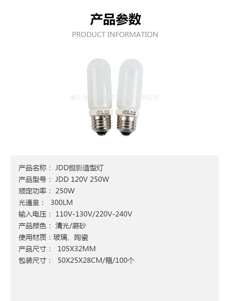 我司JDD卤素灯泡具有高显色、高光通量等特点,是摄影造型灯的优选器材。可选瓦数:75W、100W、150W、250W。可选灯头:E26、E27。