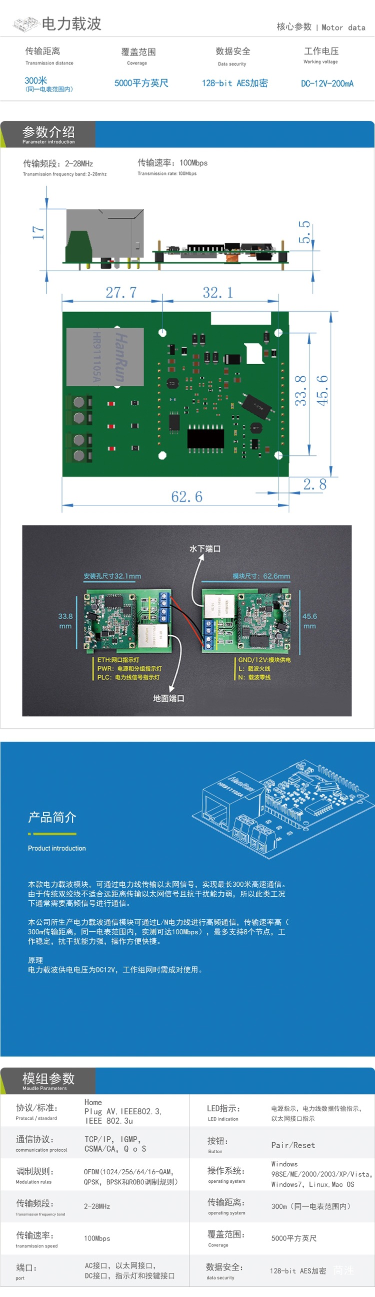 Модуль связи Rov Power Carrier 100 м Ethernet, передача видео по линии связи для подводного робота