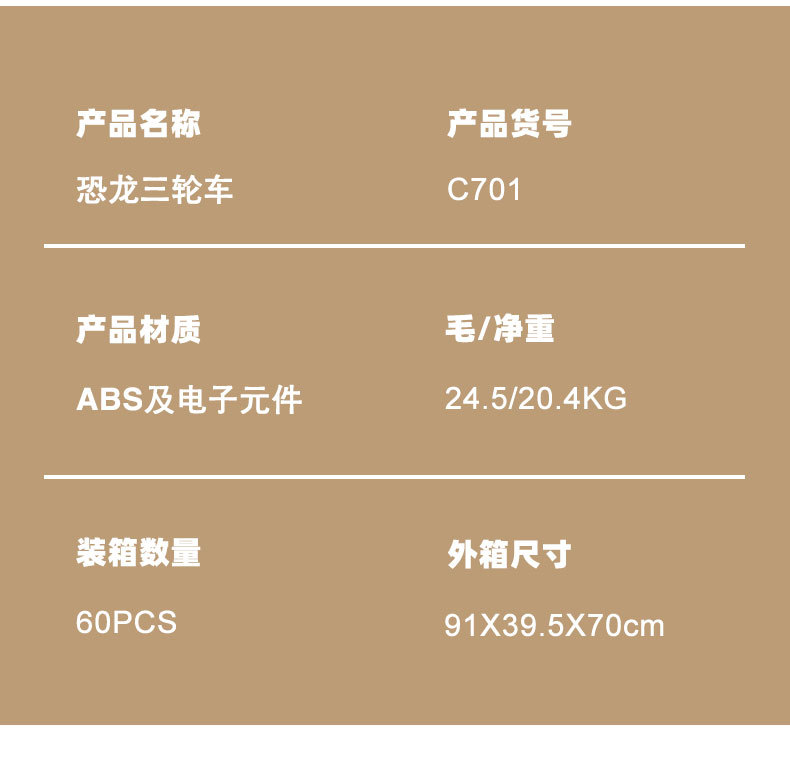 ![]() | C701 dinosaur tricycle | Screwdriver + rechargeable battery + charger | ¥19.4 / ≈ 234 ₽ | 9999 | 5953051508667 |