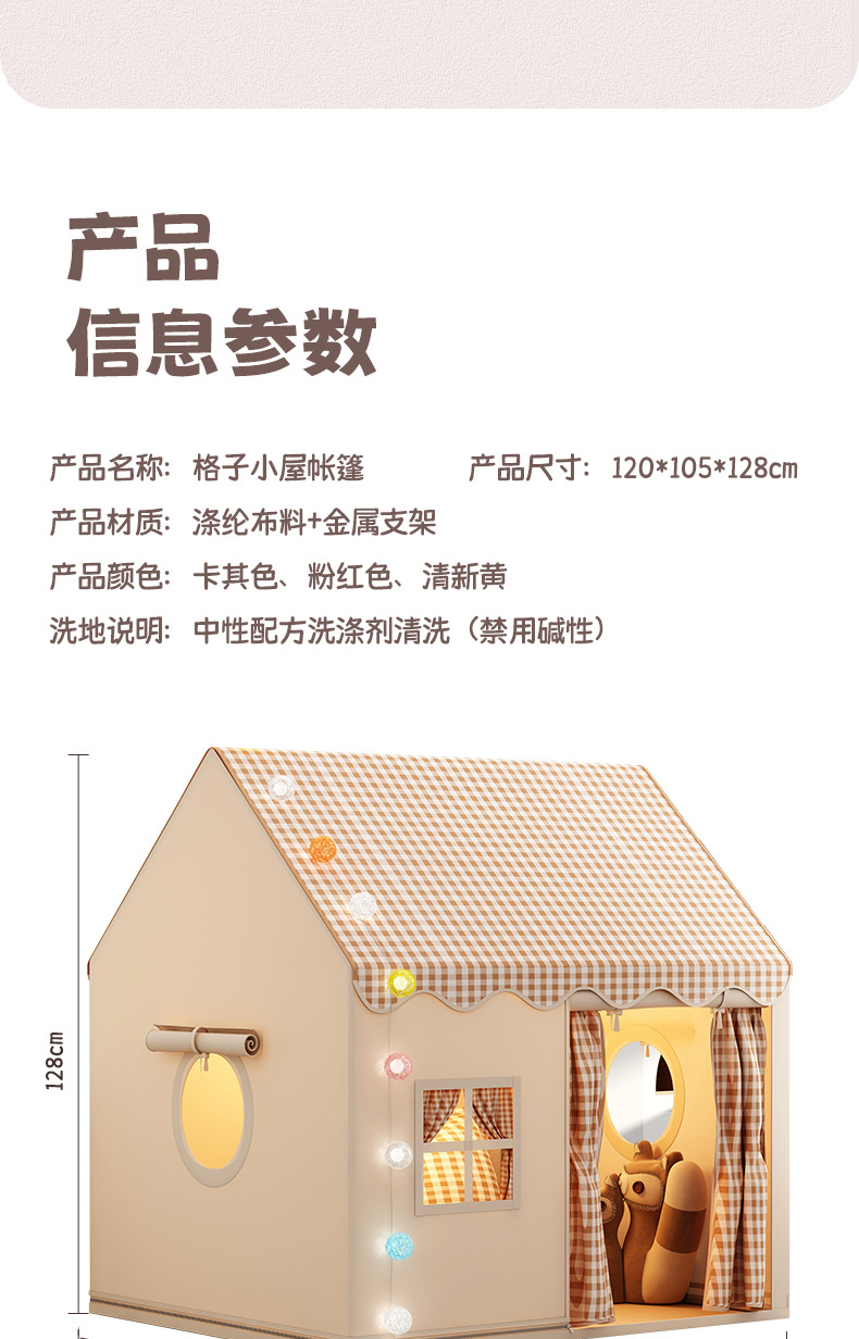 ![]() | Khaki checkered children's fun house | Single tent (metal frame) | ¥44.0 / ≈ 531 ₽ | 1900 | 6117377834473 | |