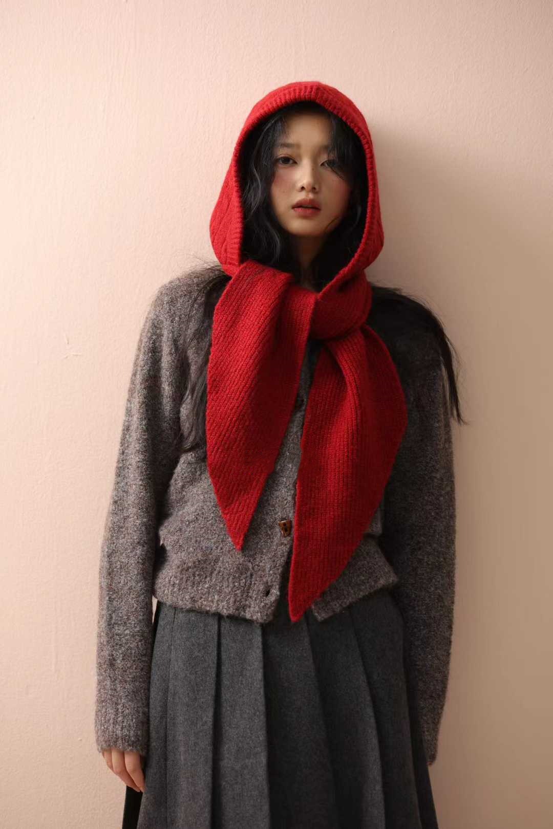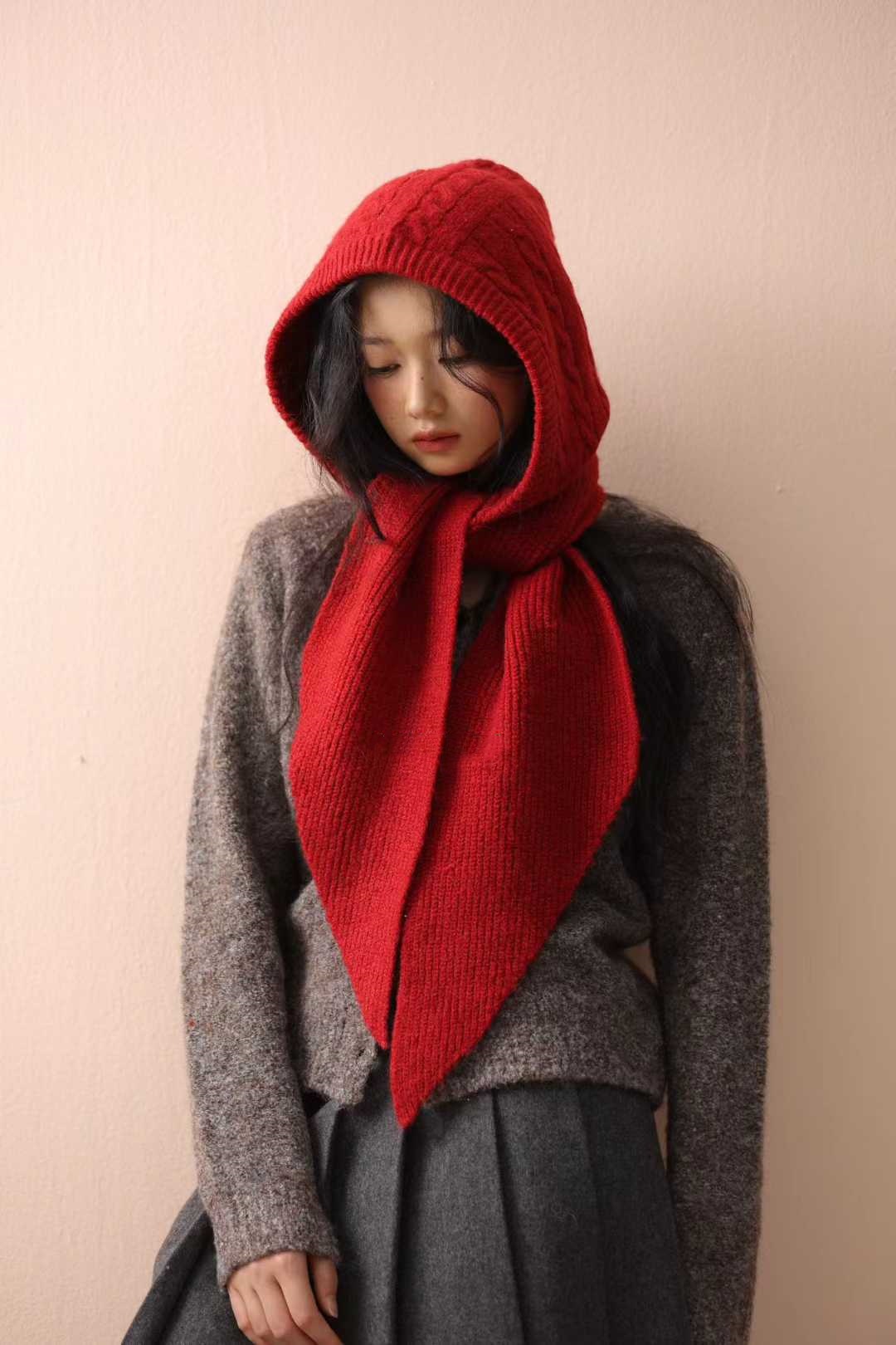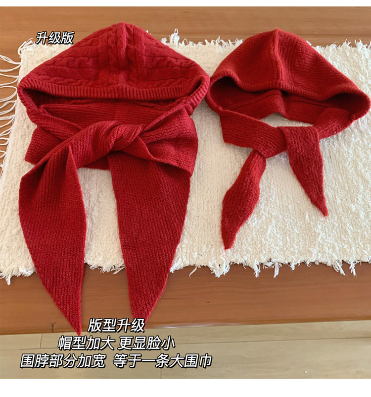 Улучшенная версия ~ Красная шерстяная балаклава для женщин с большой окружностью головы, зимняя вязаная шапка и шарф в одном