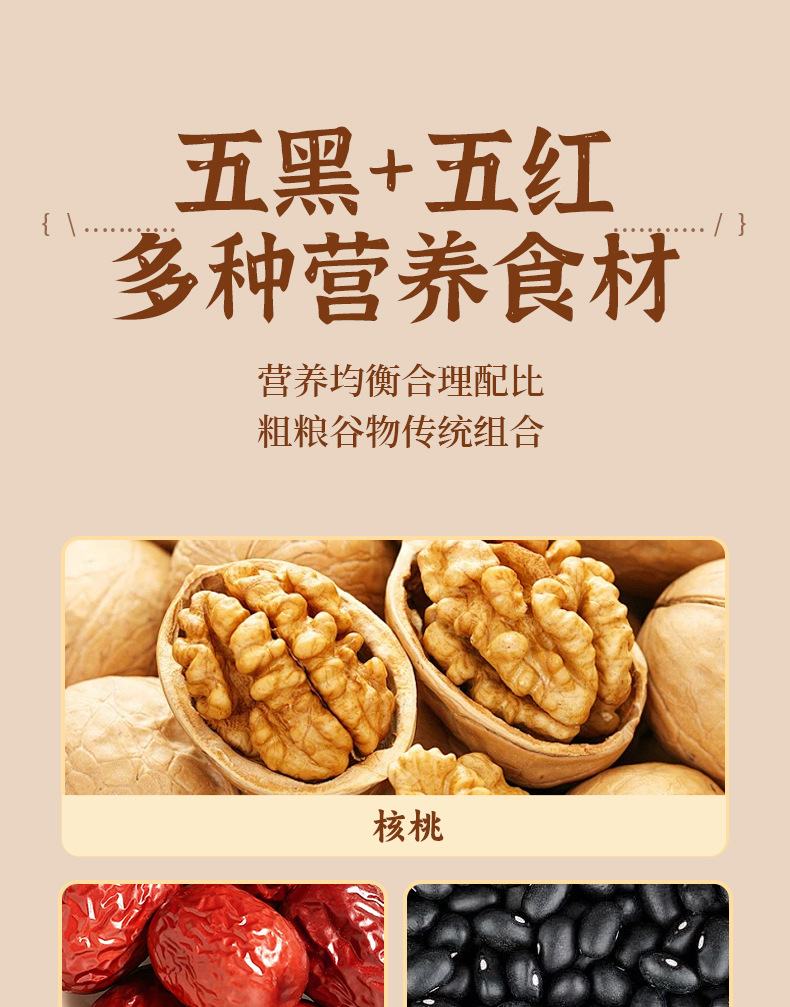Сырьё и ингредиенты Wheat flour, blood glutinous rice, diced red dates, red beans, red wolfberry, walnuts. red rice flour, peanuts, maltitol, black bean flour, black rice flour