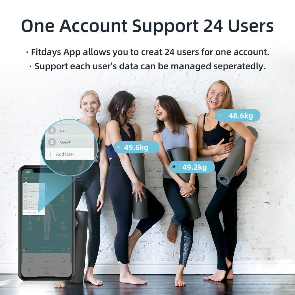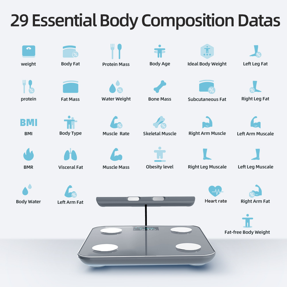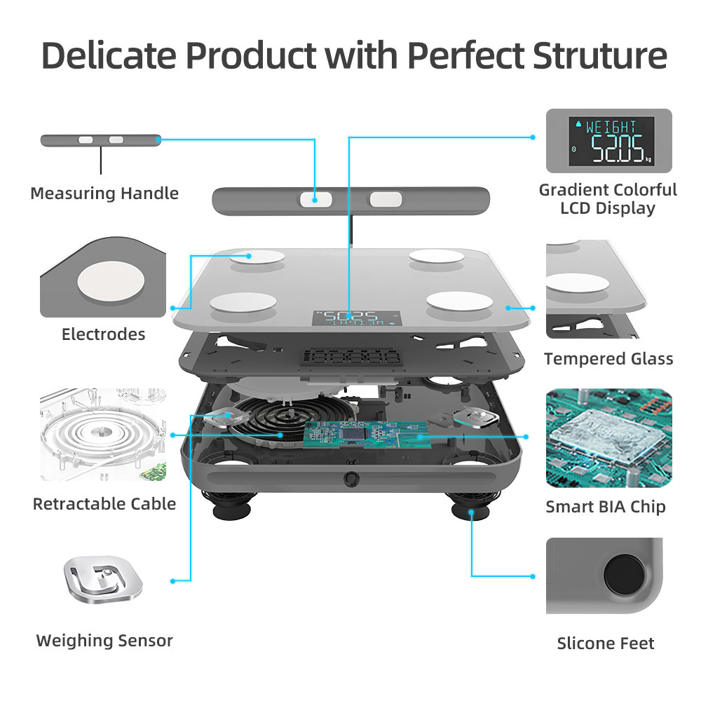 8个电极的智能身体脂肪秤*8个高精度传感器,用于专业手到脚身体阻抗测量*详细的全身分析,带有应用程序连接*用户识别用于身体测量。