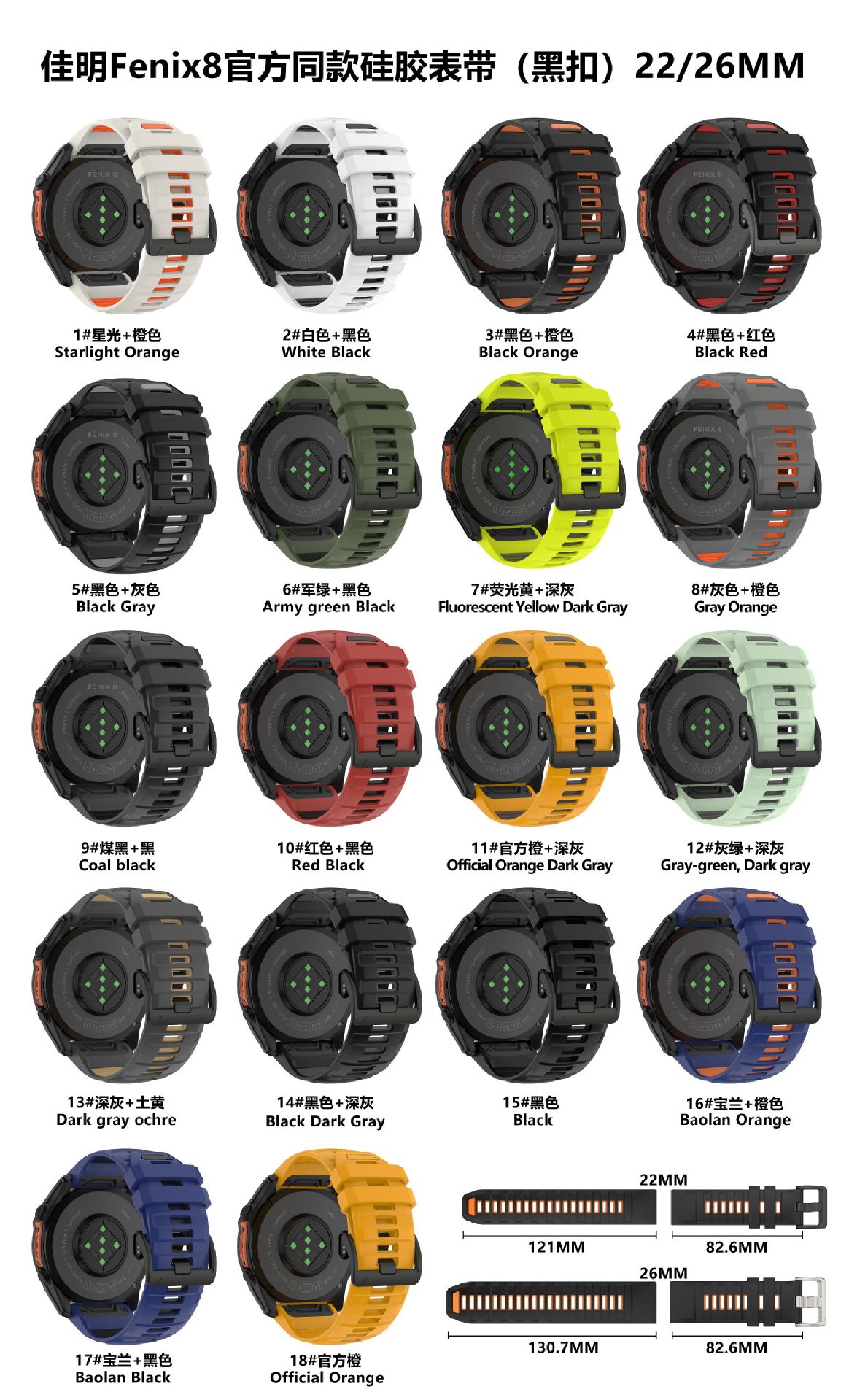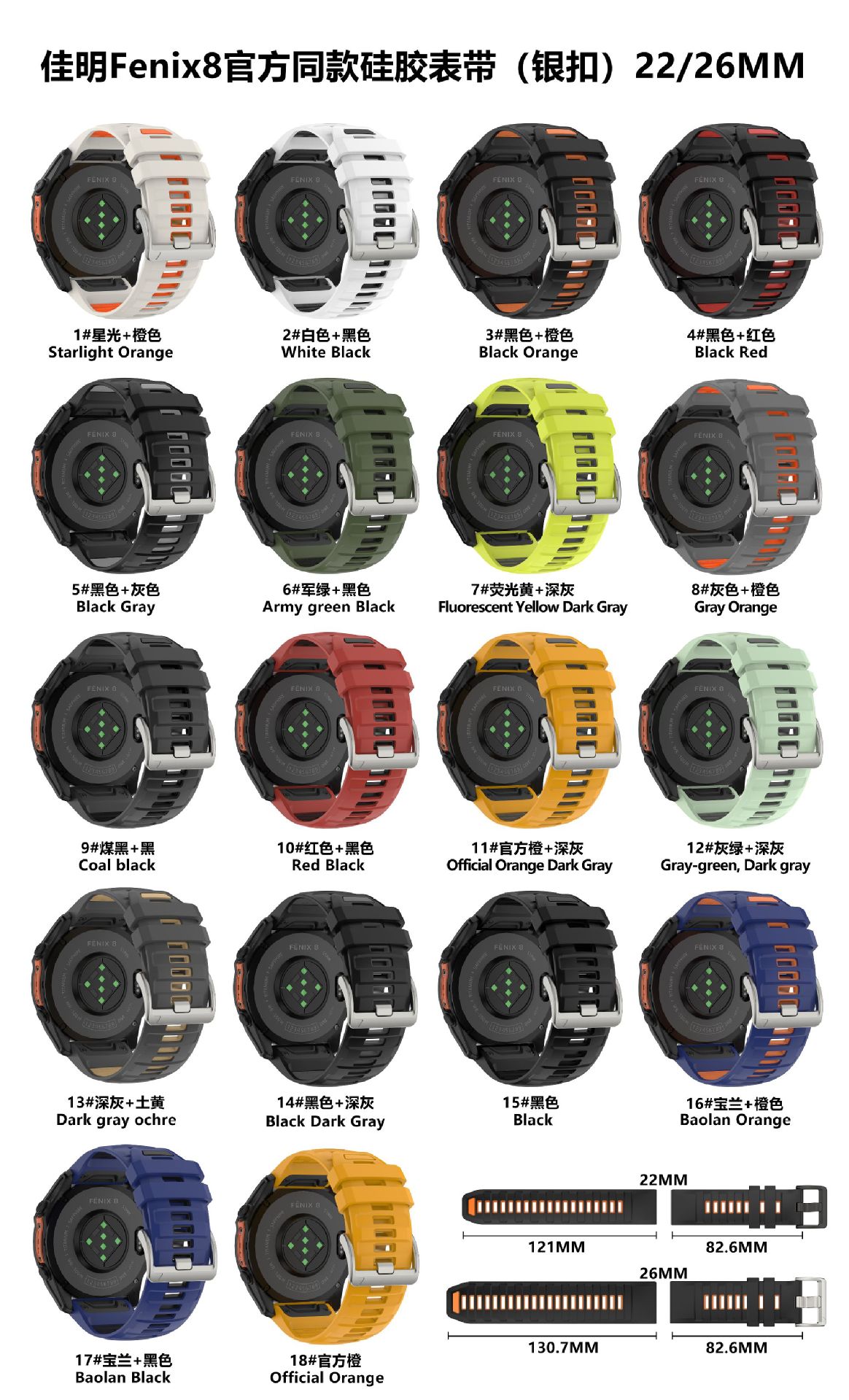 Совместим с ремешком Garmin Fenix8, двухцветный официальный силиконовый ремешок 22/26мм