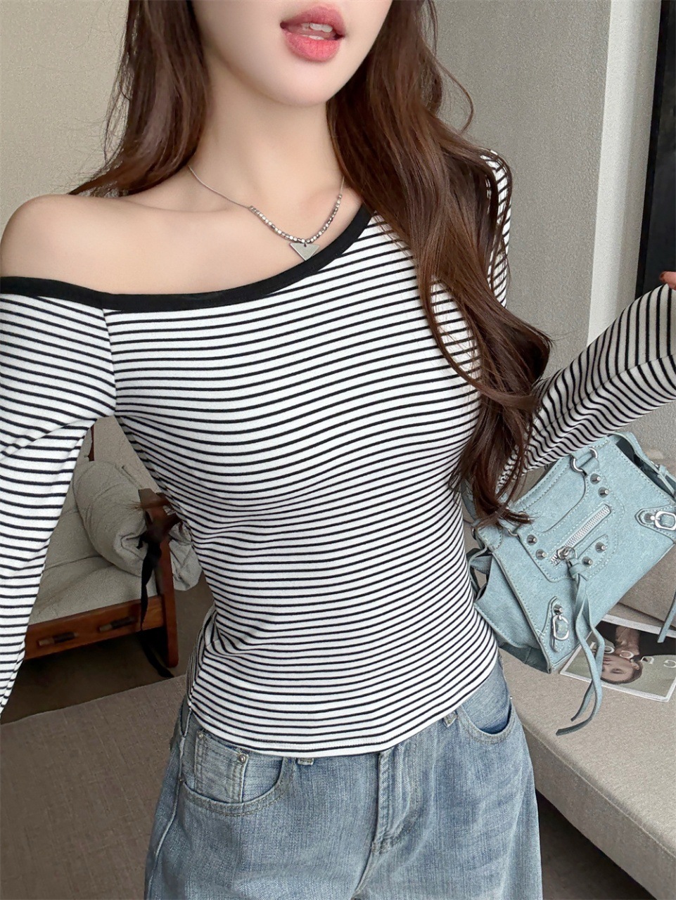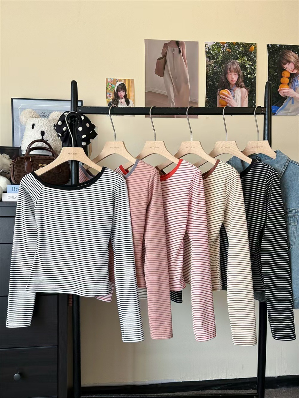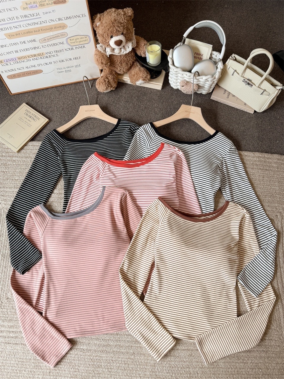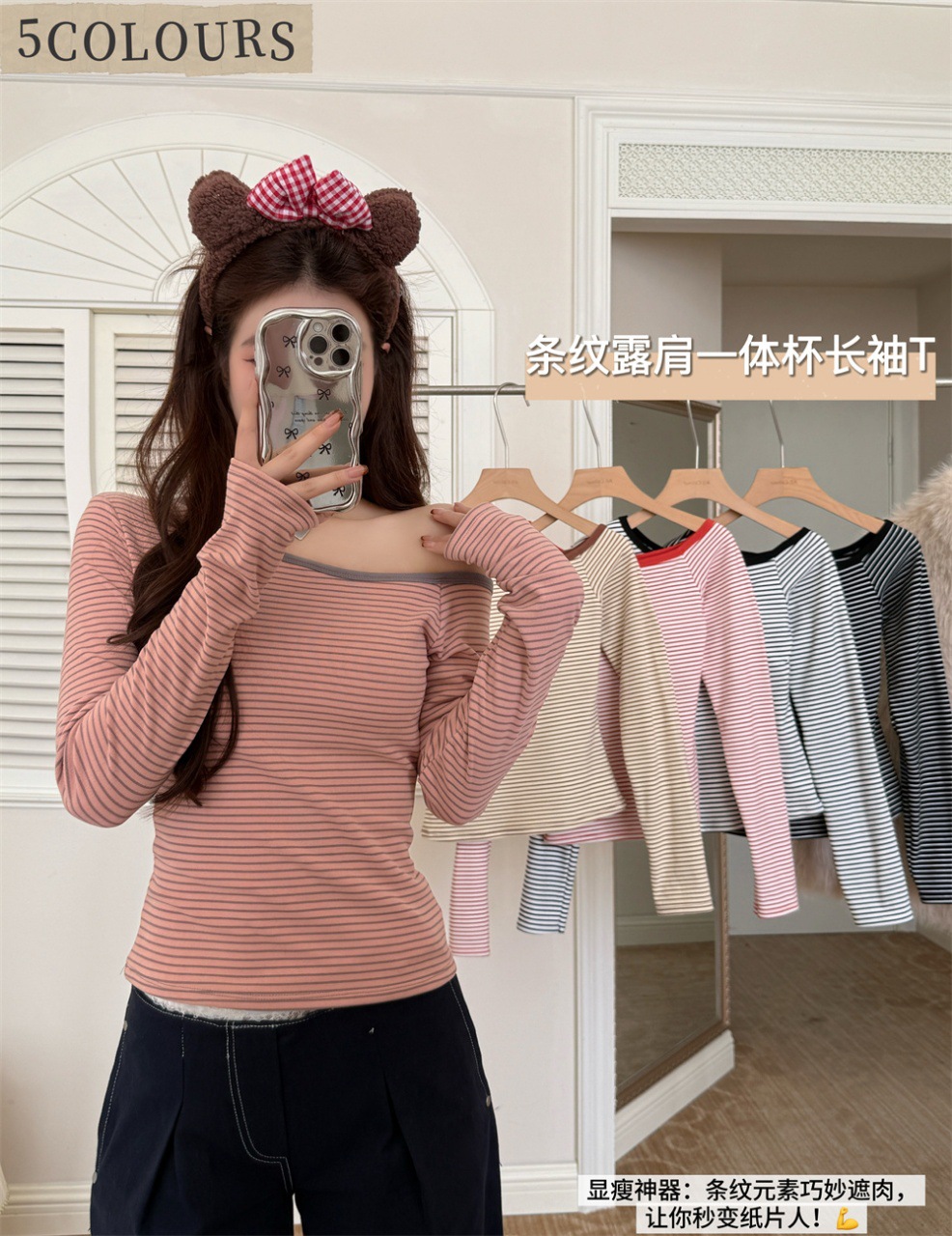 5180 # 280г кашемировая теплая полосатая футболка длинный рукав женская нишевая с открытыми плечами контрастный цвет полосатый топ