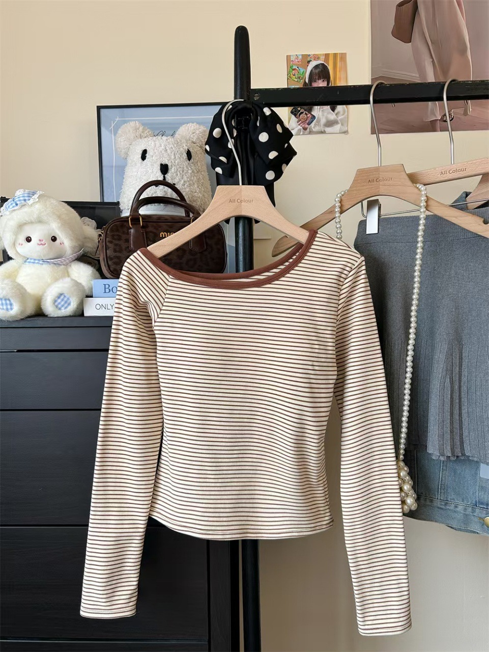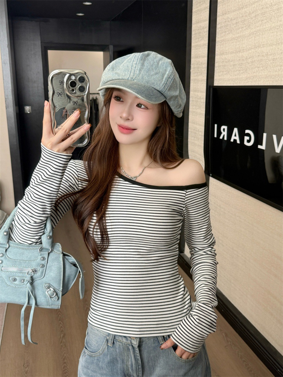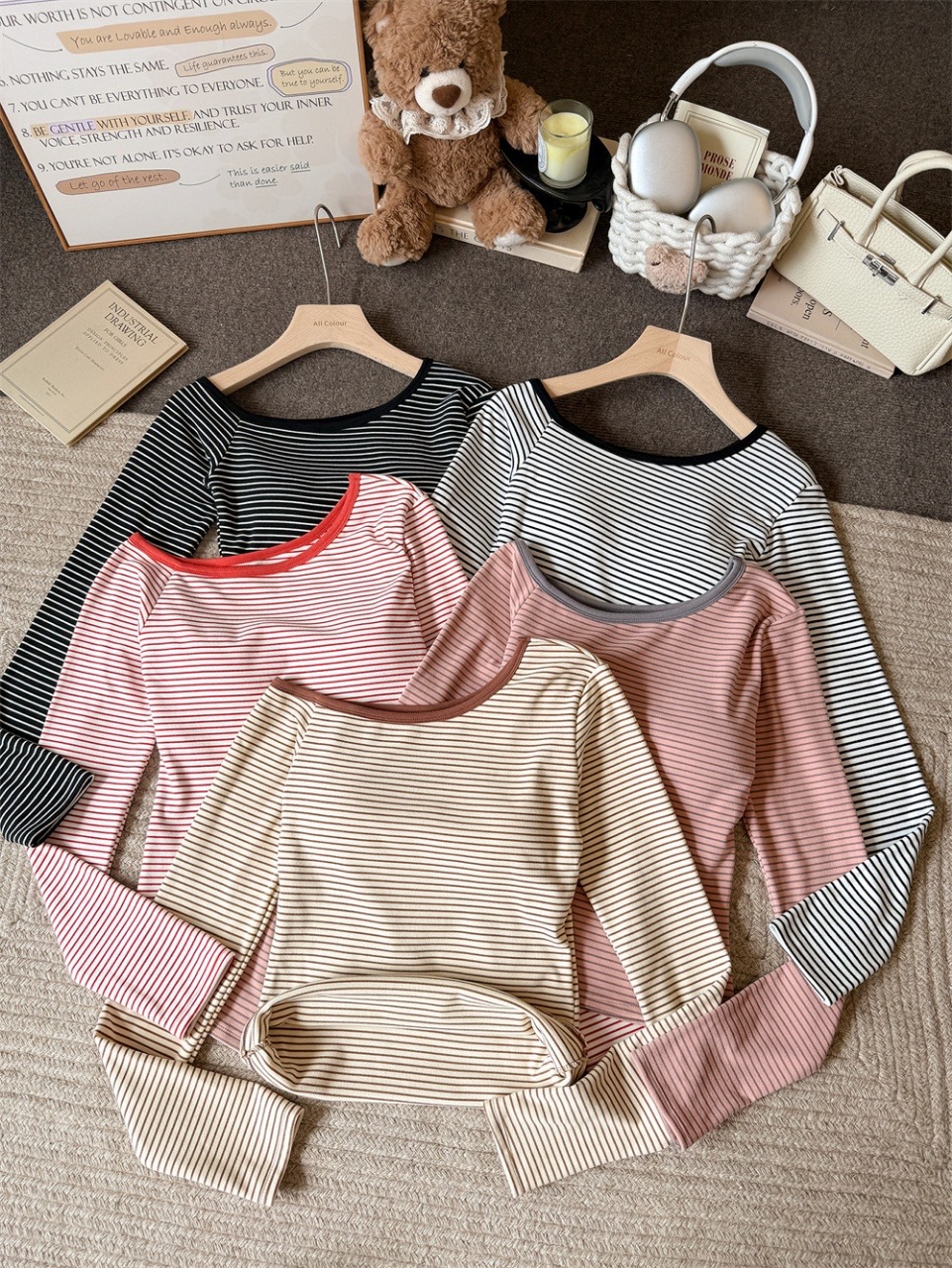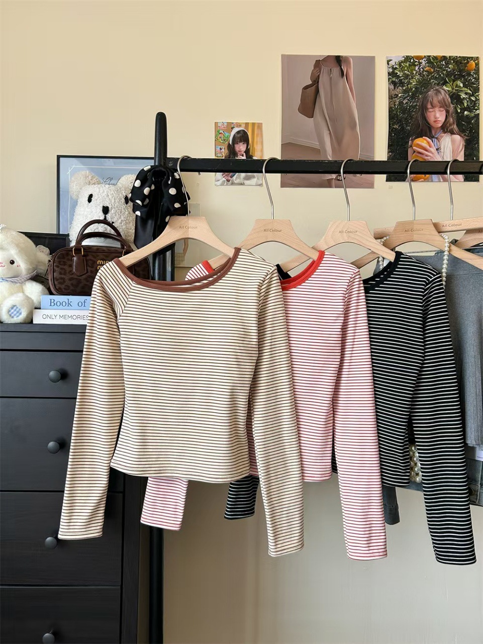 5180 # 280г кашемировая теплая полосатая футболка длинный рукав женская нишевая с открытыми плечами контрастный цвет полосатый топ