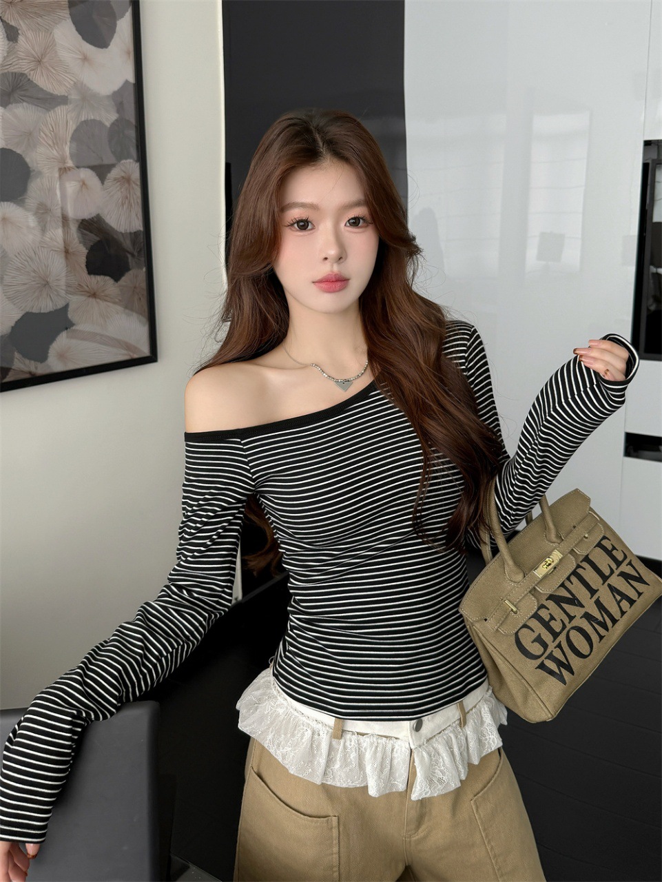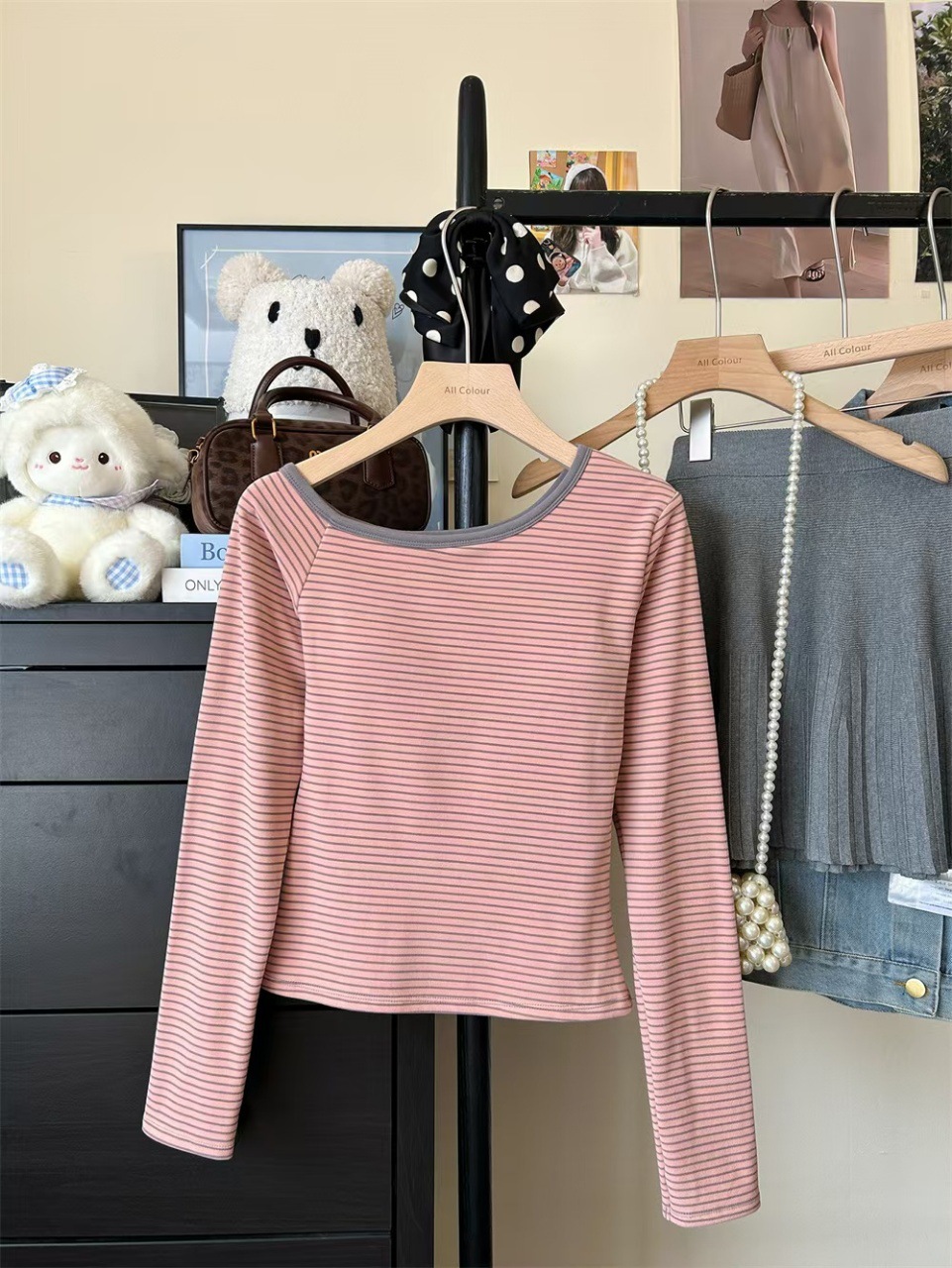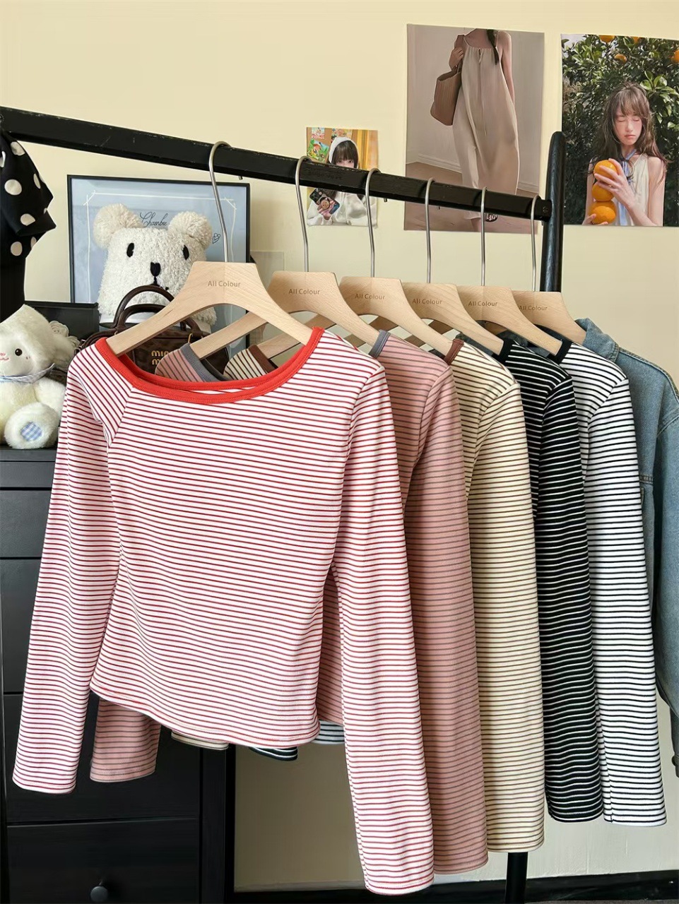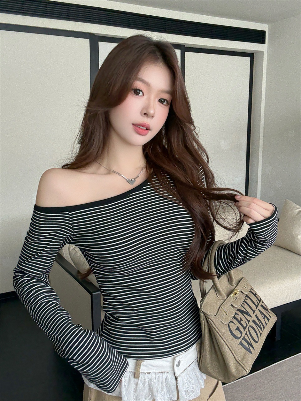 5180 # 280г кашемировая теплая полосатая футболка длинный рукав женская нишевая с открытыми плечами контрастный цвет полосатый топ