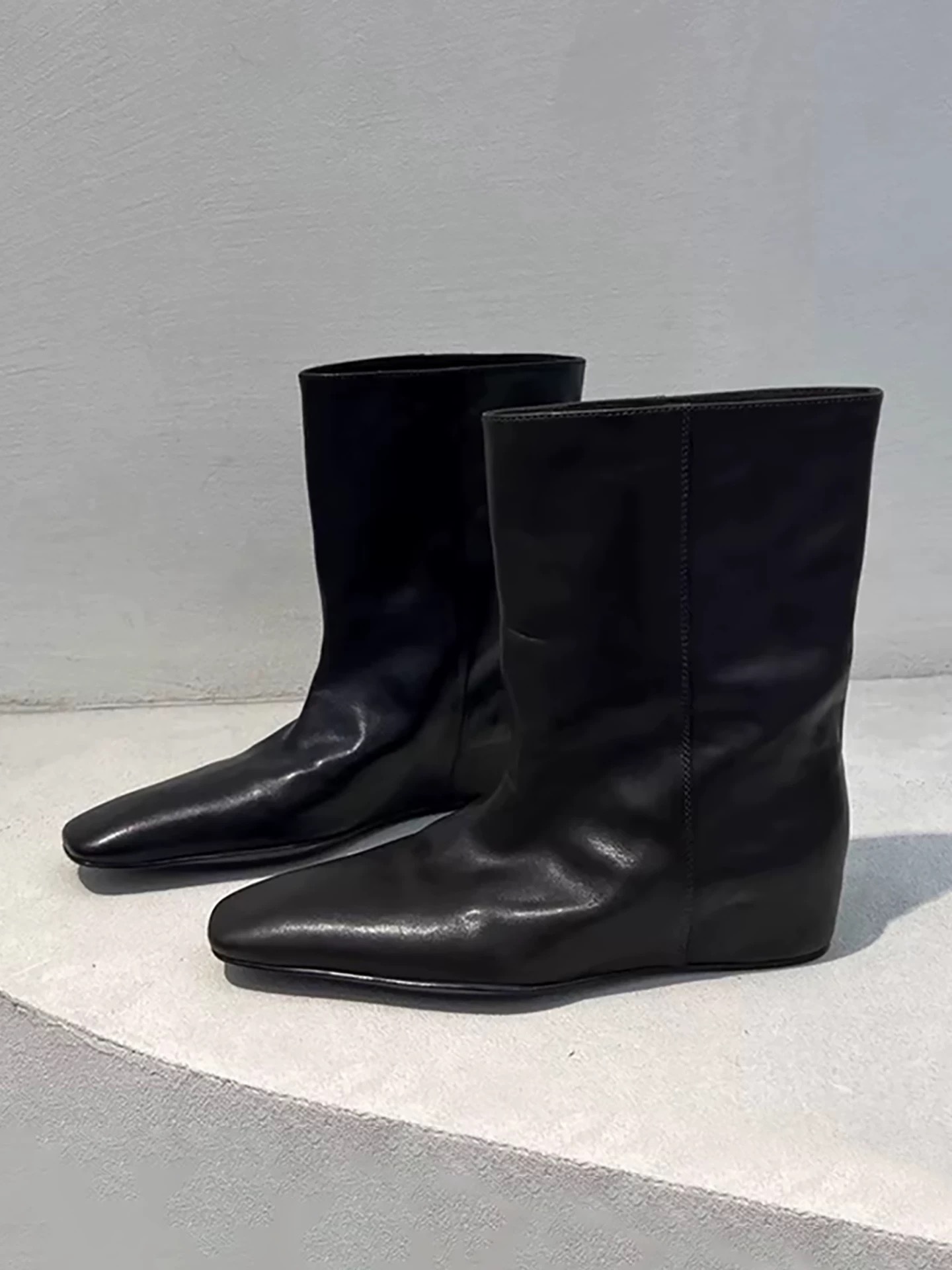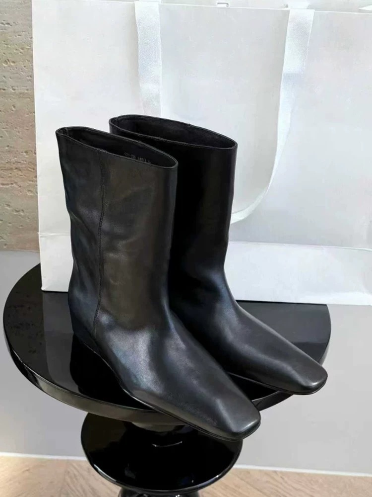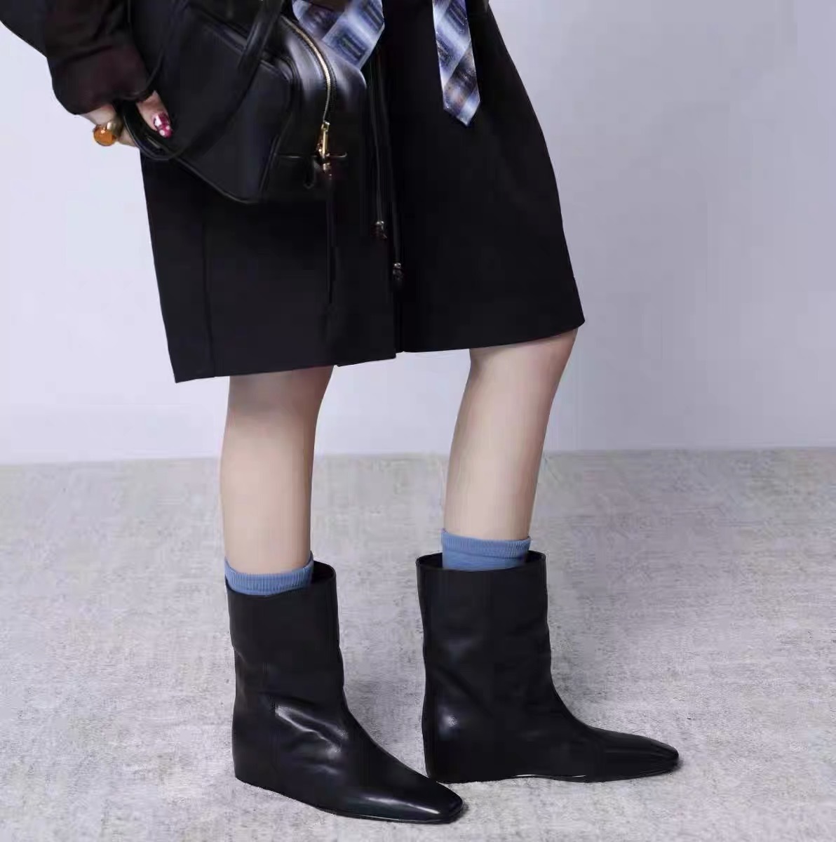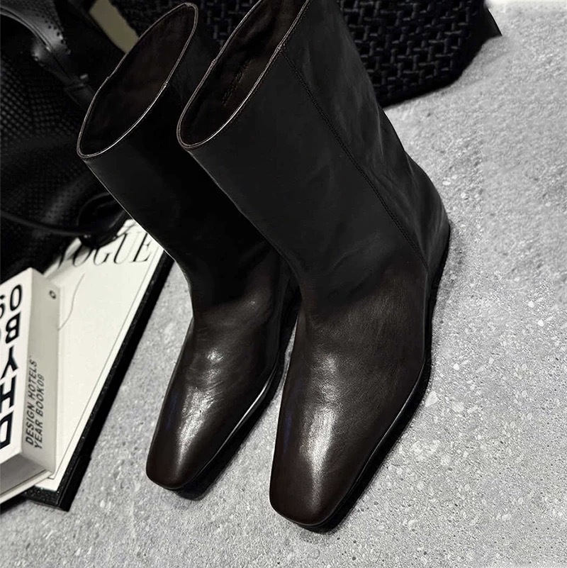 Кожаная версия ~ винтажные нишевые ботинки с квадратным носком внутренним увеличением для женщин осень и зима ботинки до середины икры челси