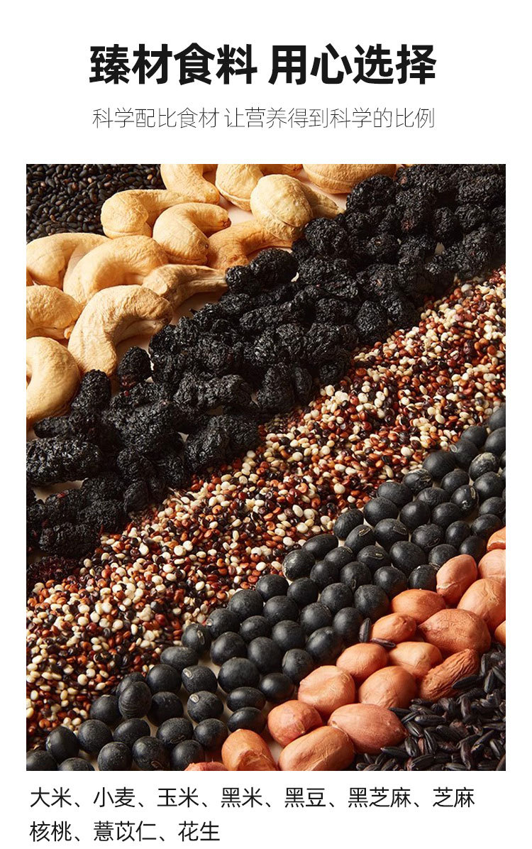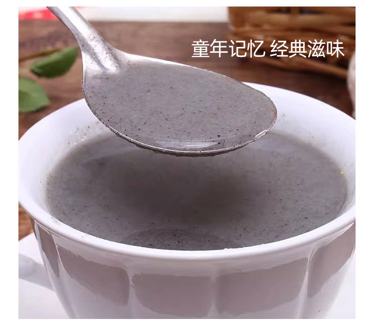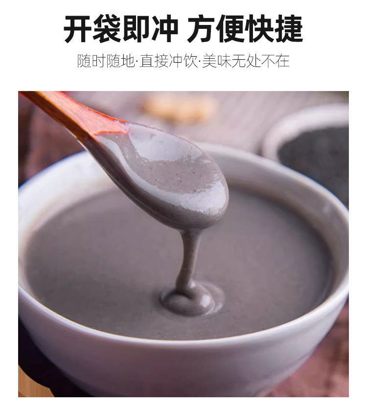 Сырьё и ингредиенты Grain coarse grain powder (rice, wheat, corn, black rice, black beans), black sesame (added amount ≥18.5%), white sugar, edible glucose, sesame,