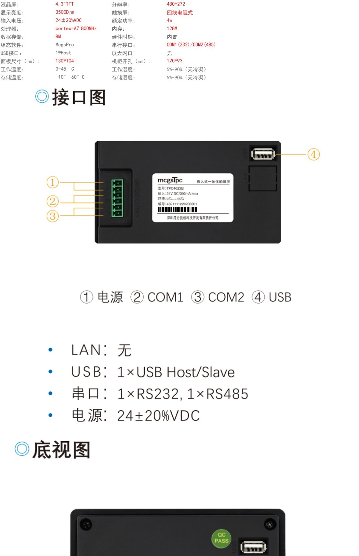 TPC4023Ei Kunlun Сенсорный экран 4.3 дюйма 232+485+ сетевой порт Разрешение 480*272 Промышленный черный