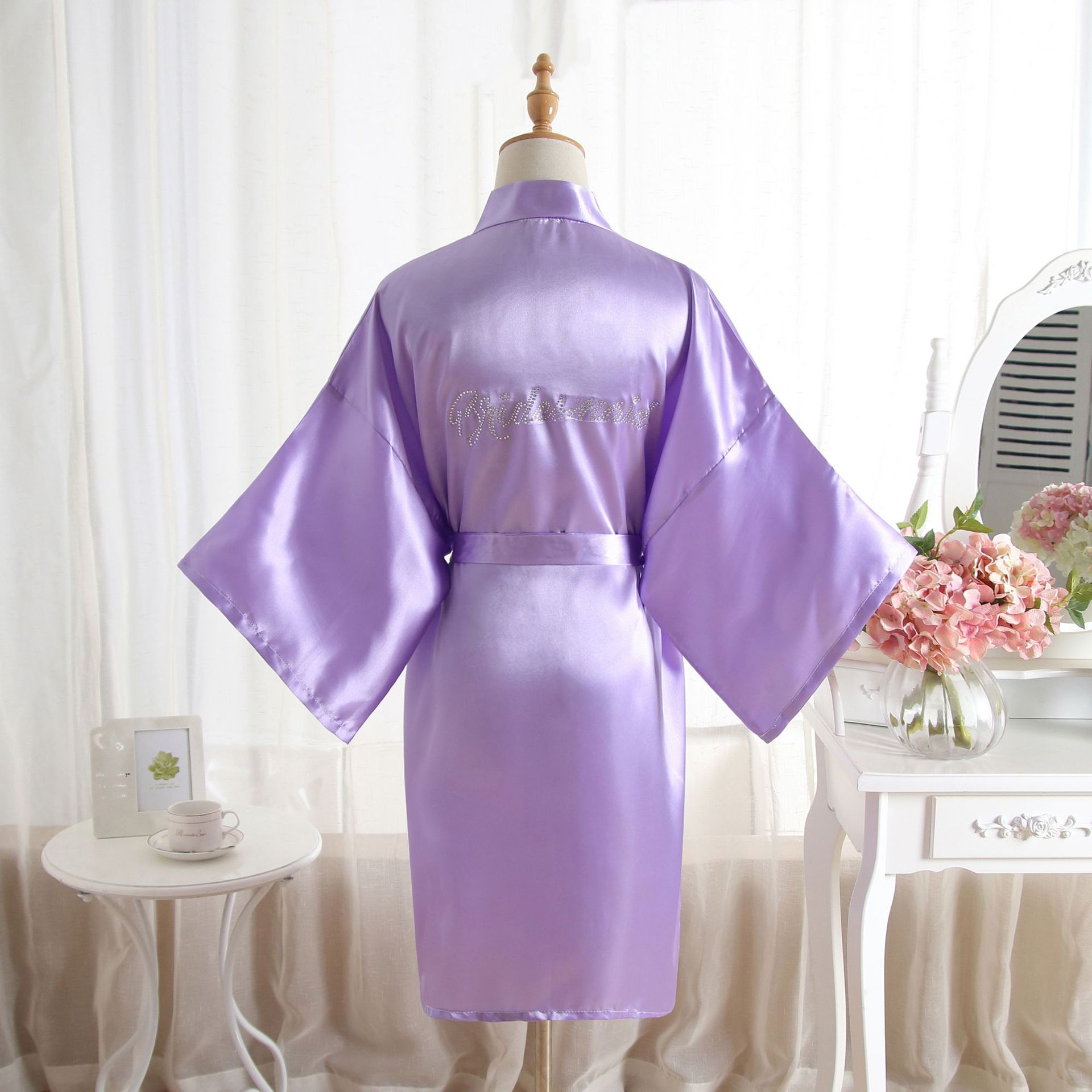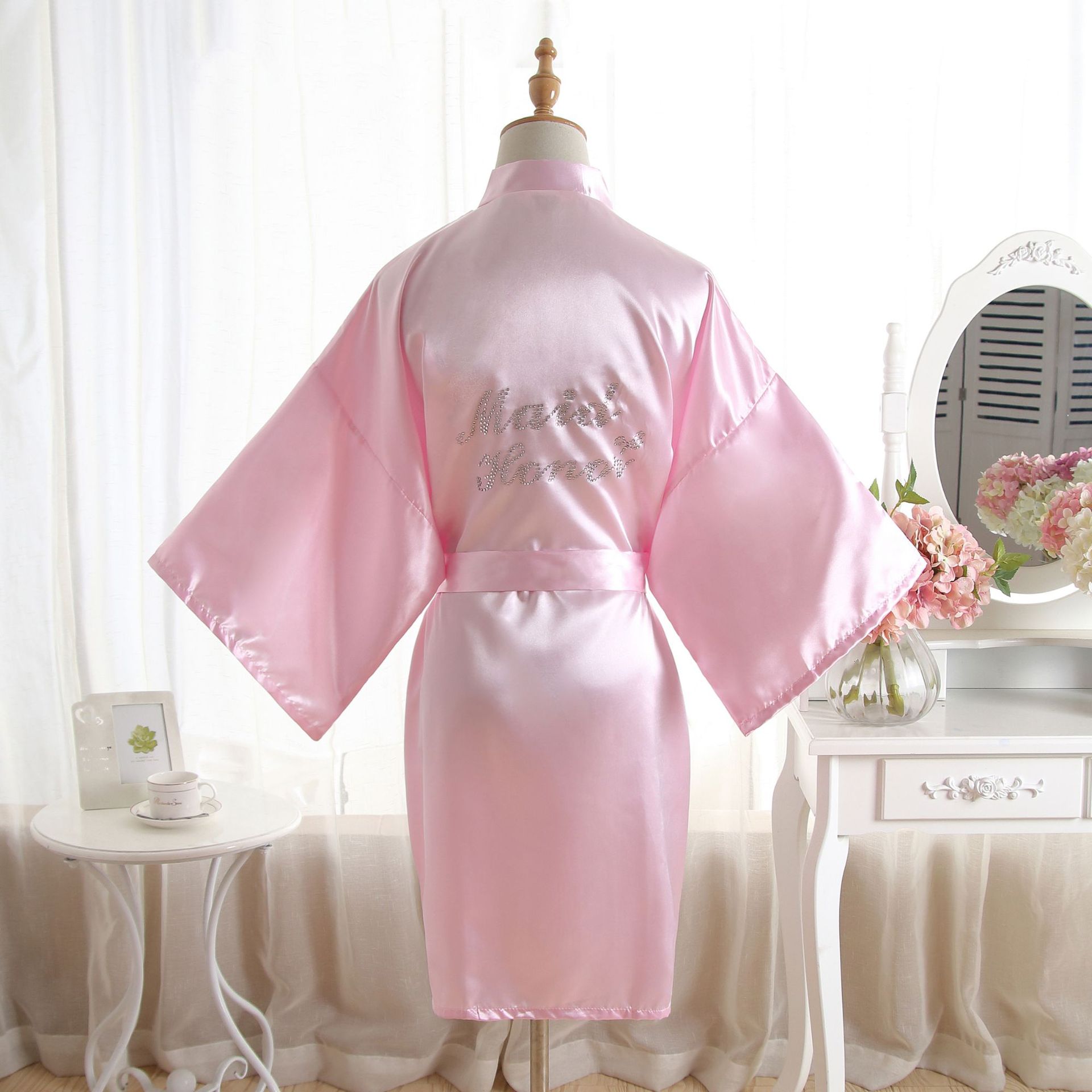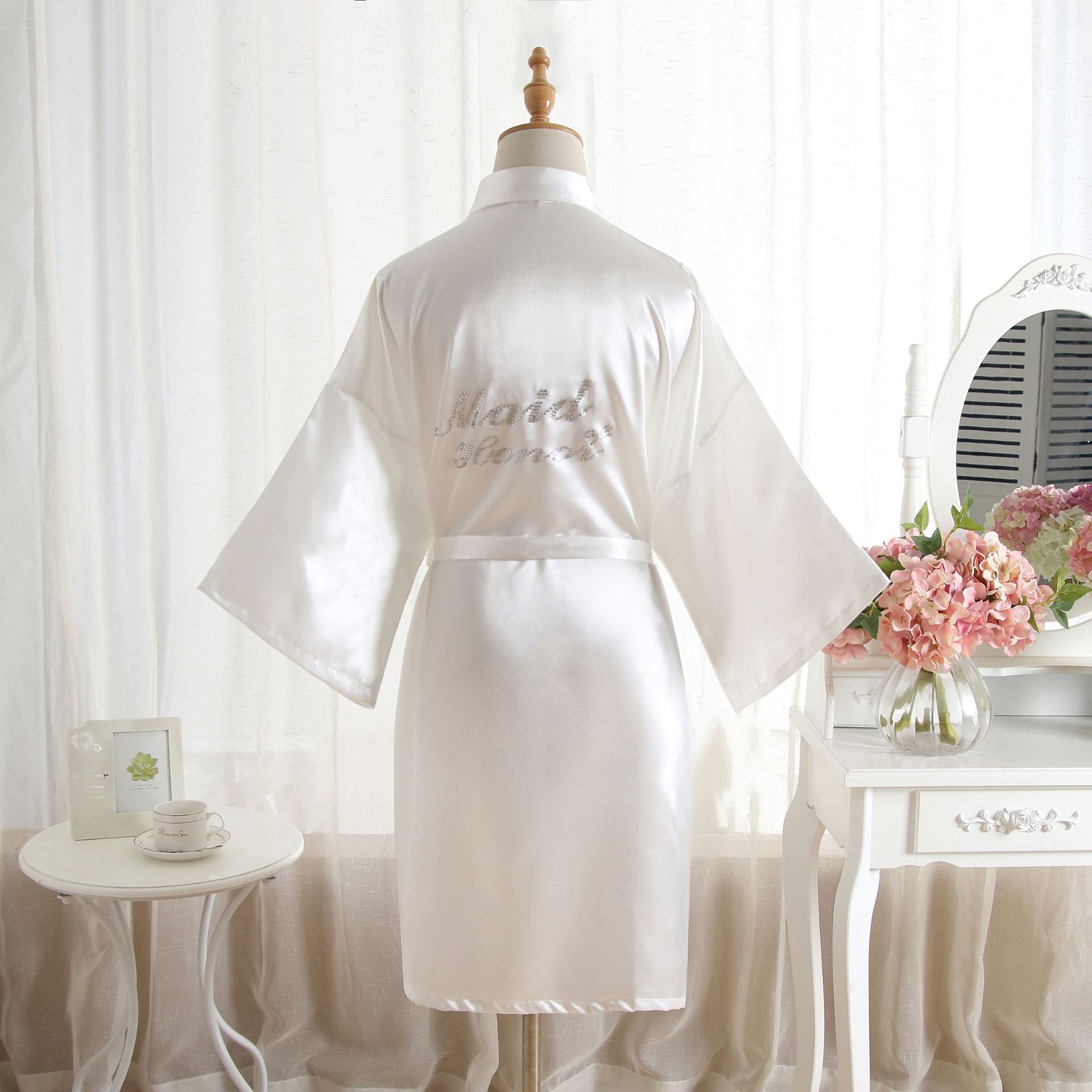 类似款:纯色同款晨袍伴娘Bridesmaid,首席伴娘Maid of honor,新娘母亲Mother of the Bride。以上字母均有现货。另有白色烫钻同款哦