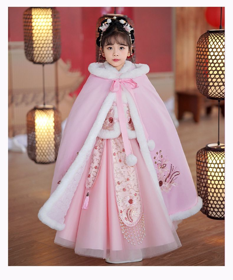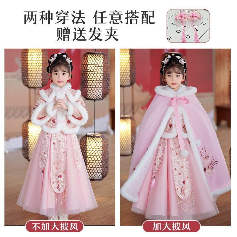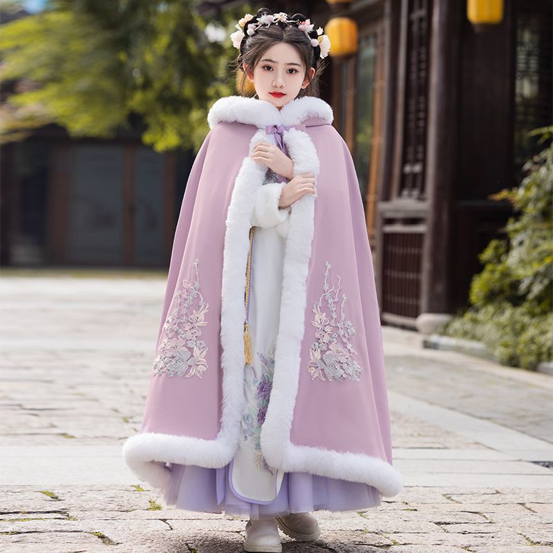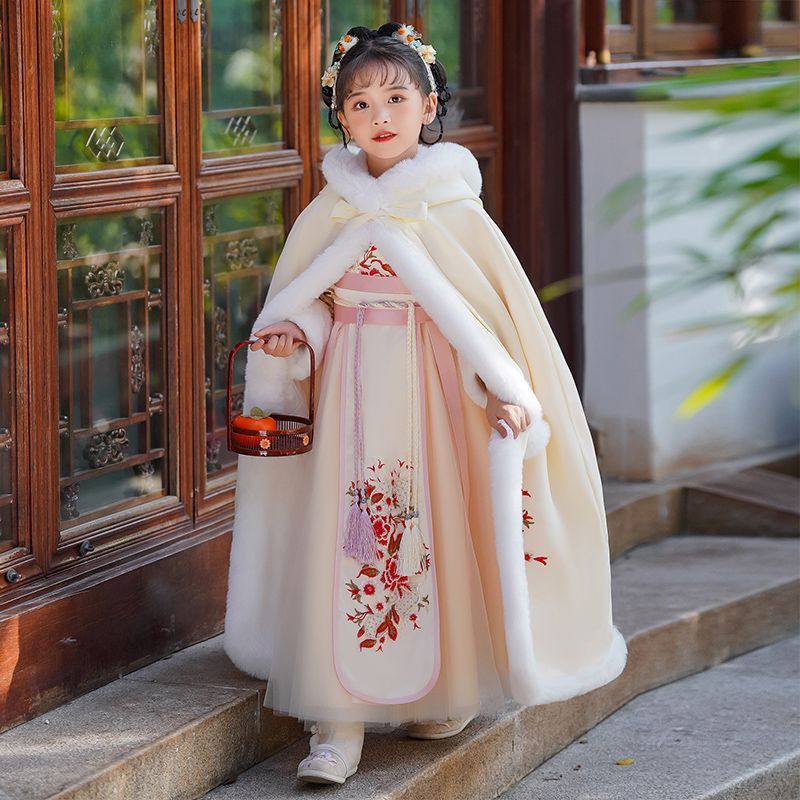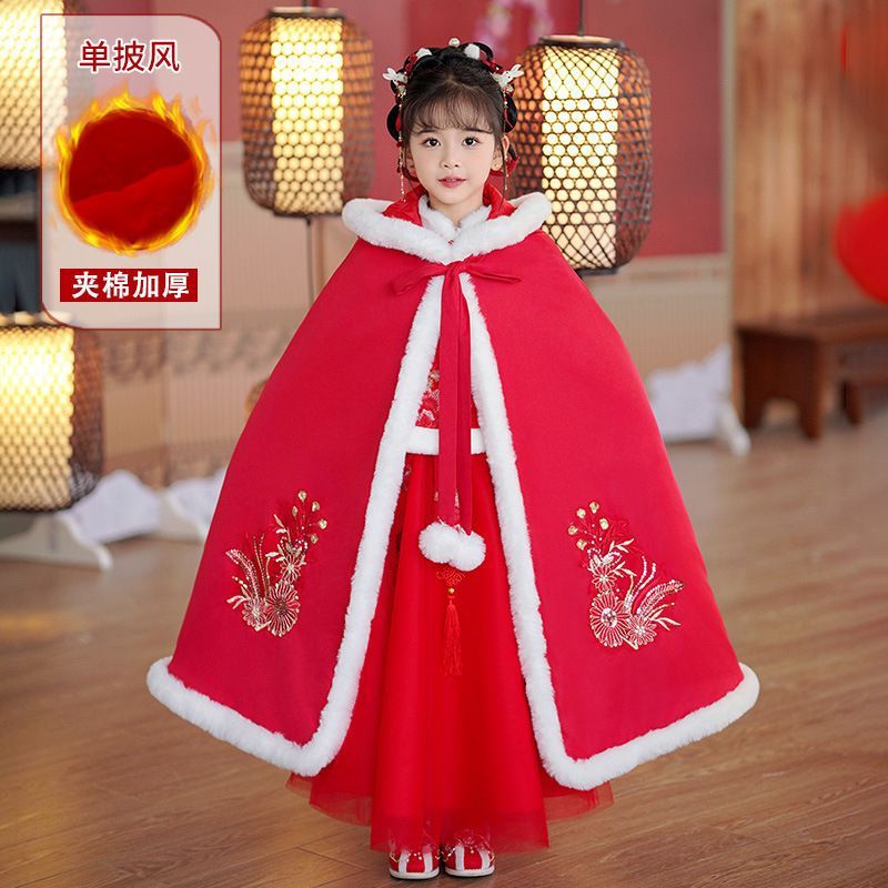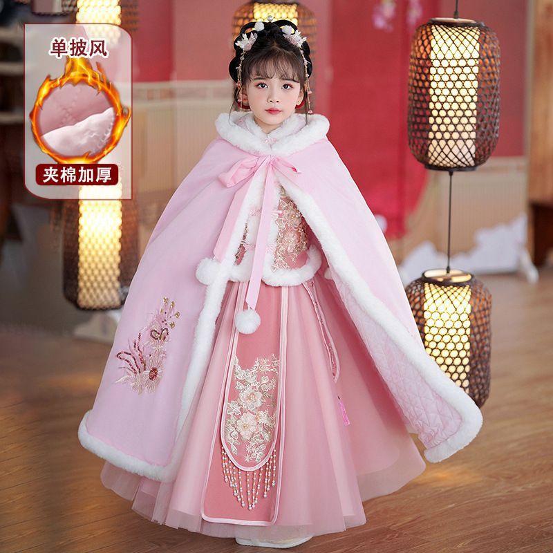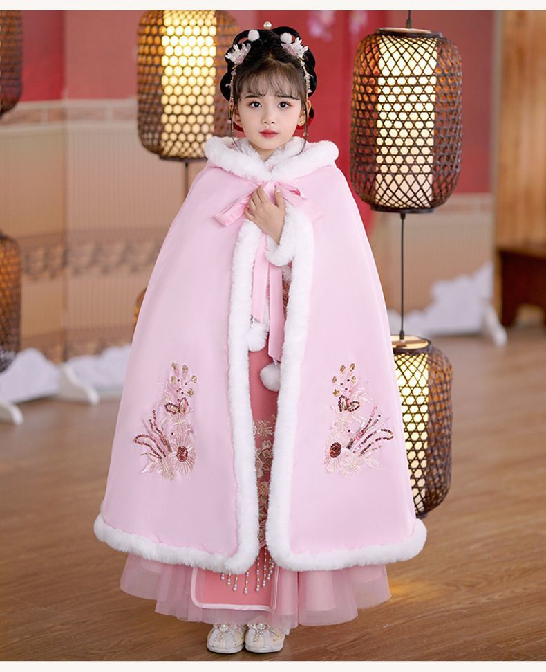 Зимняя китайская верхняя одежда, костюм династии Хань для девочек, капюшон, утепленный, уличный, ветрозащитный плащ, костюм для маленькой девочки