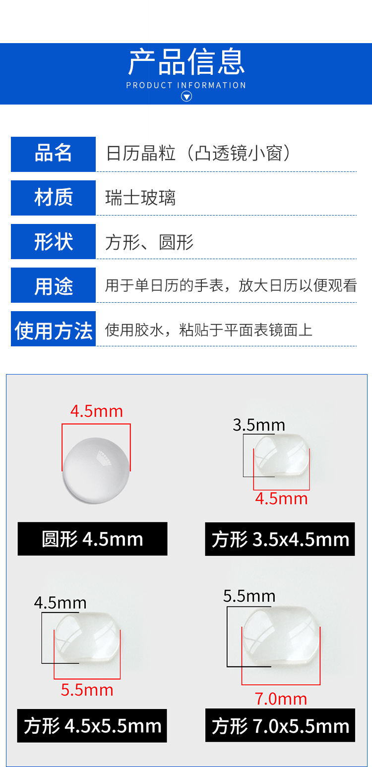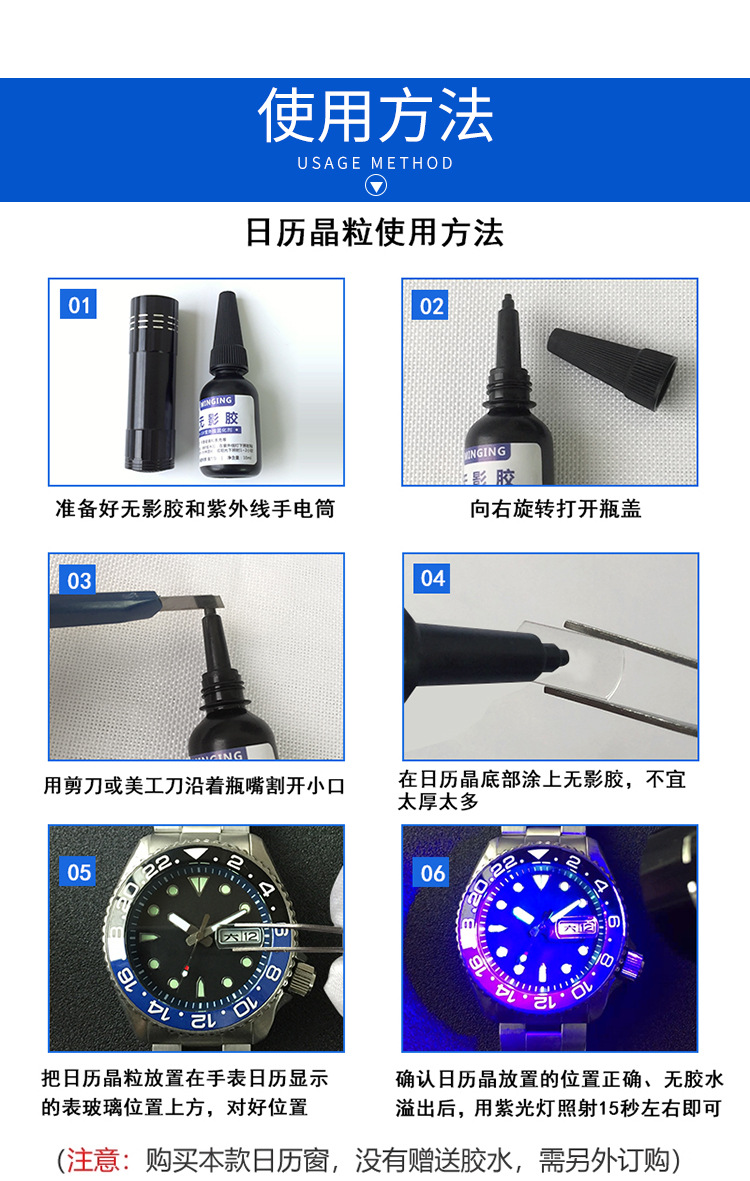 注意使用的胶水适用于粘玻璃且不会发白。日历晶适合粘在平面的表镜上,表镜有弧度的(单卜、双卜、锅盖等)不适合哦!请以您手表实际使用大小为准选购日历晶粒尺寸。本款一般是专业维修师傅使用,但是安装方法相对比较简单,没有维修经验的客户也可以尝试自己安装,以下有参考方法。如果实在不确定自己能安装的亲 慎拍哦!