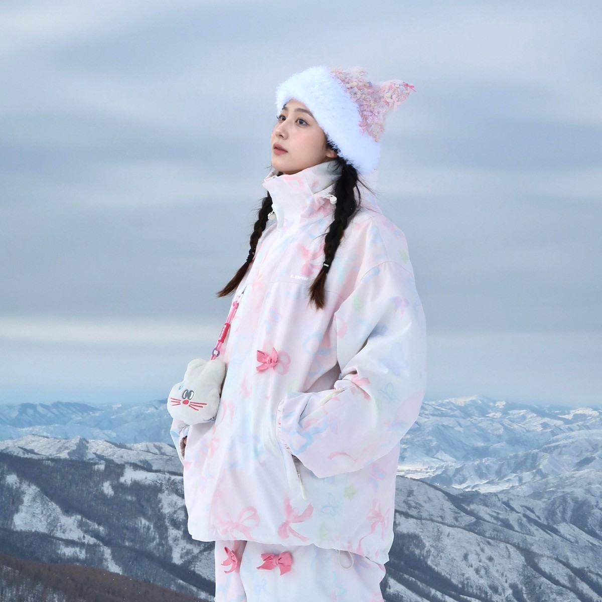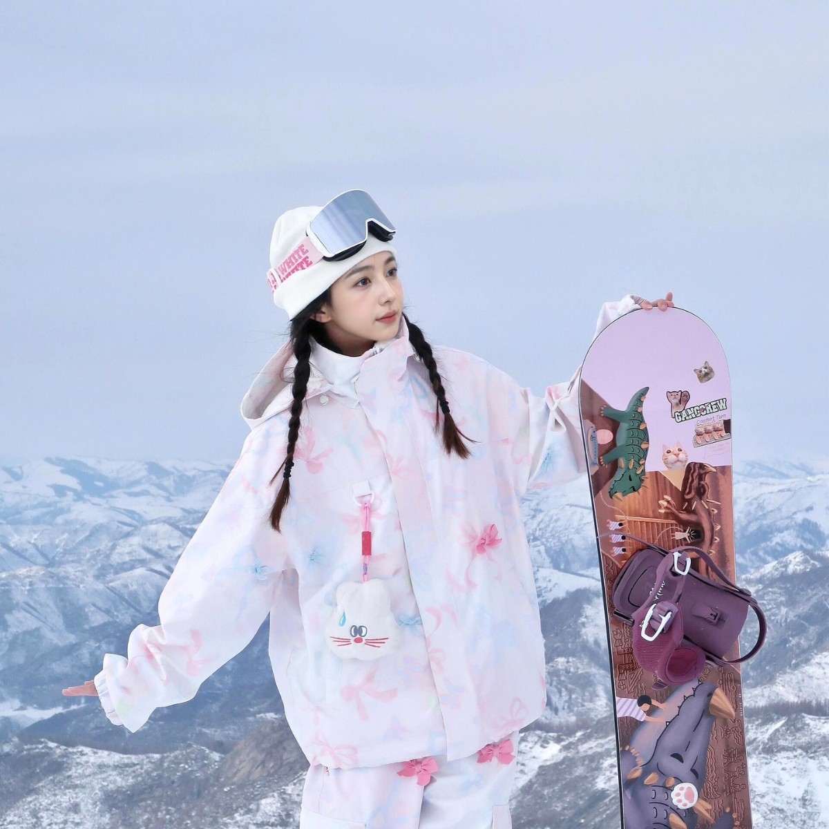 Куртка и брюки для лыж Фуян розовые с бантом для женщин 2025 новые двухслойные высококачественные лыжные брюки комплект из двух частей