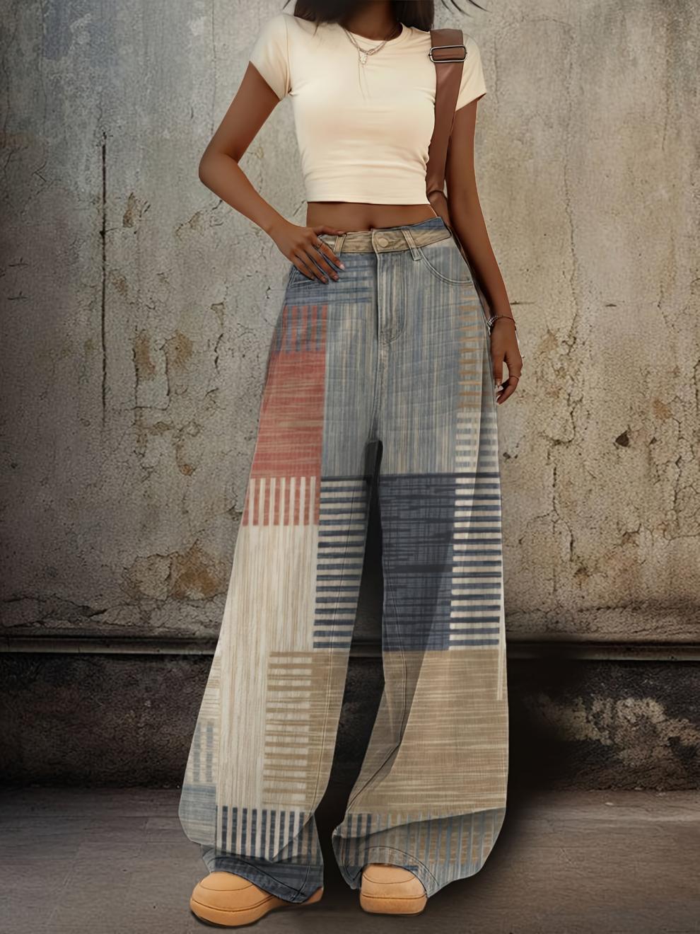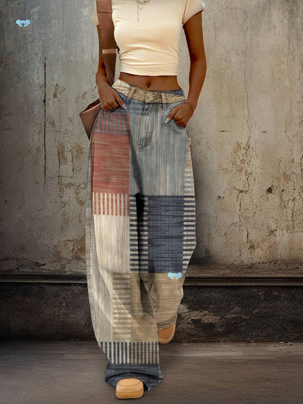 Женские джинсы с широкими штанинами D 862 ретро 3D печать - омбре в стирке