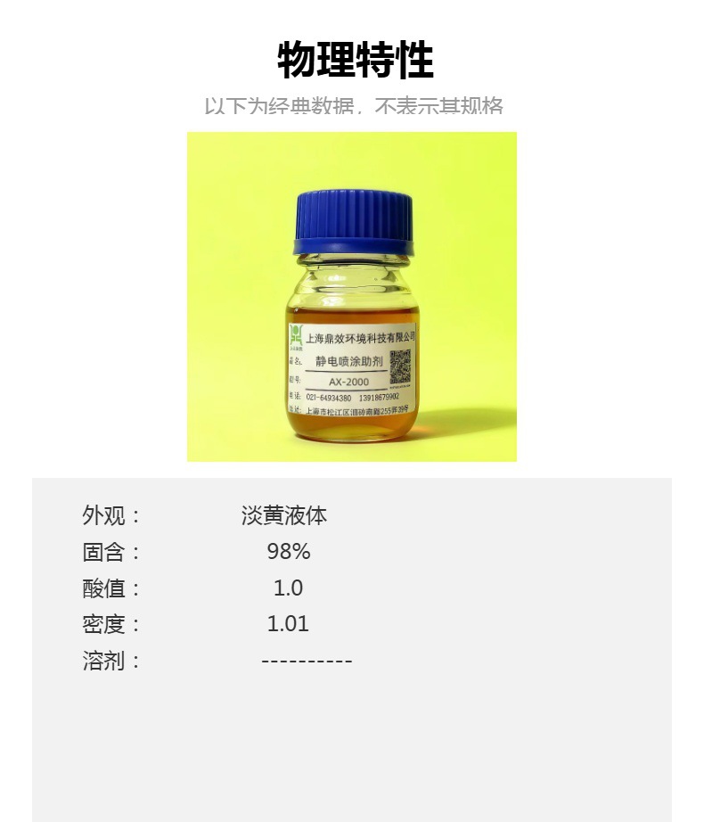 AX2000是一种杂环化合物,添加涂料中具有优异的导电率,降低涂膜表面电阻、防止涂膜电凝聚、防止涂膜表面灰尘吸附、适用于静电喷涂涂料中。