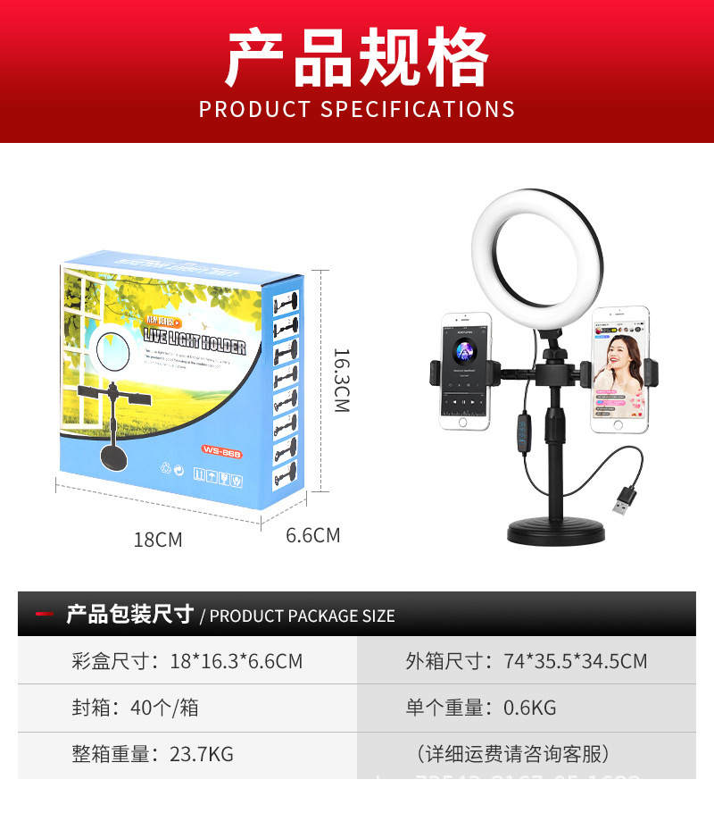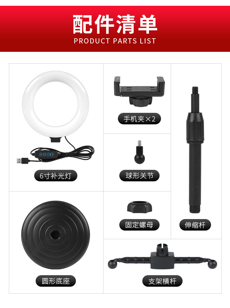 📦 | Dual camera + (6inch lights) + disc desktop stand | 80шт: ¥6.80, 1000шт: ¥6.70, 5000шт: ¥6.50 | 788702 | 6127307894071 |