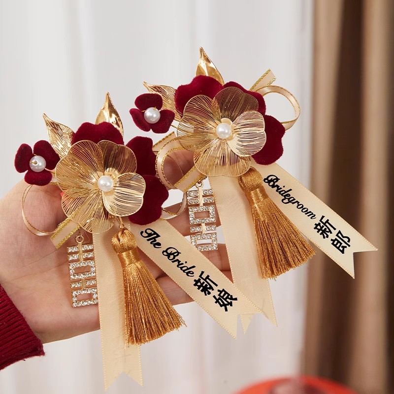 Бутоньерка для невесты и жениха бордового цвета вертикальный шрифт лента шампань цвет заметка VIP менеджера