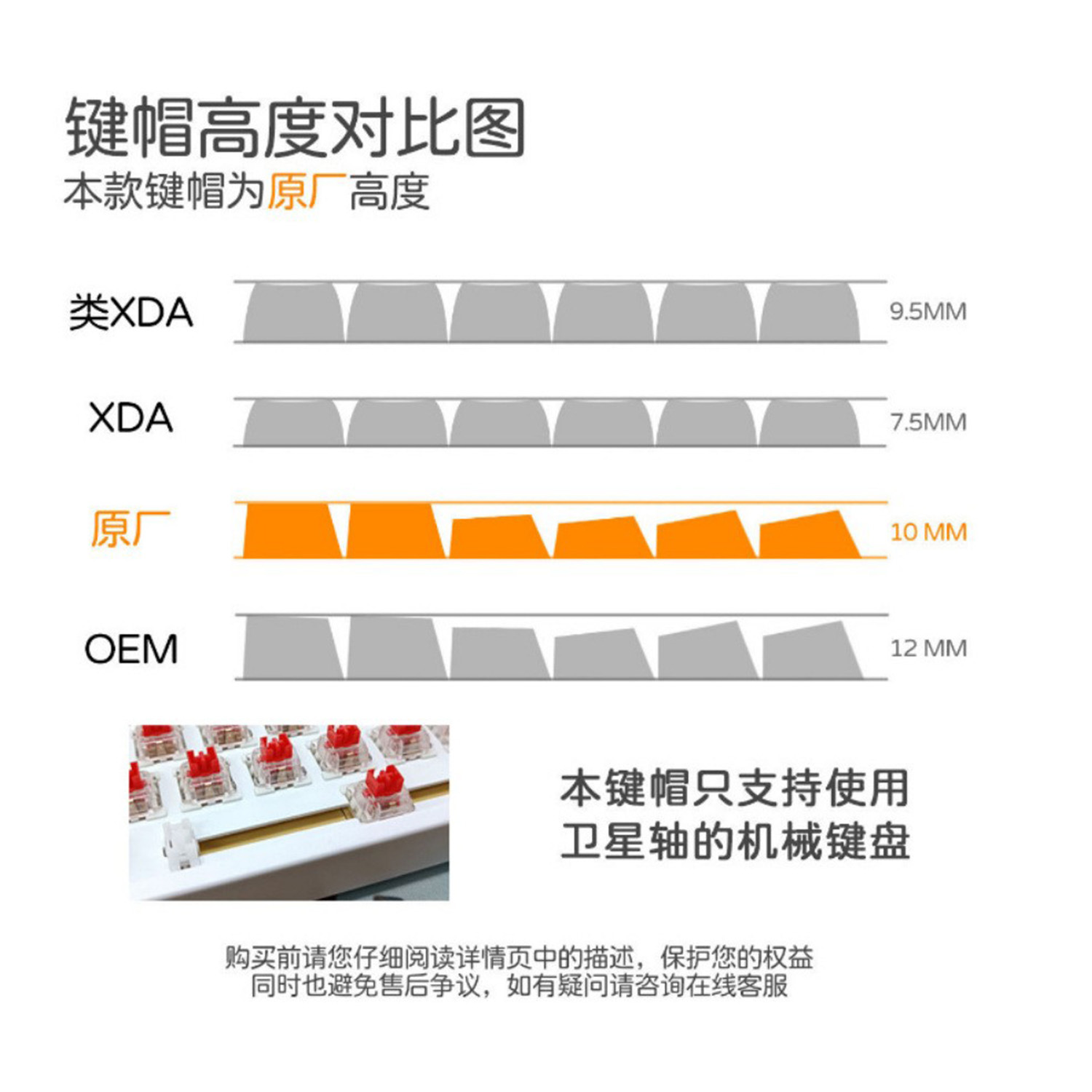 本产品为原厂高度,PBT材质足料85%+不虚标,遮光、抗油不打滑,适用于任何颜色5面热升华!!!