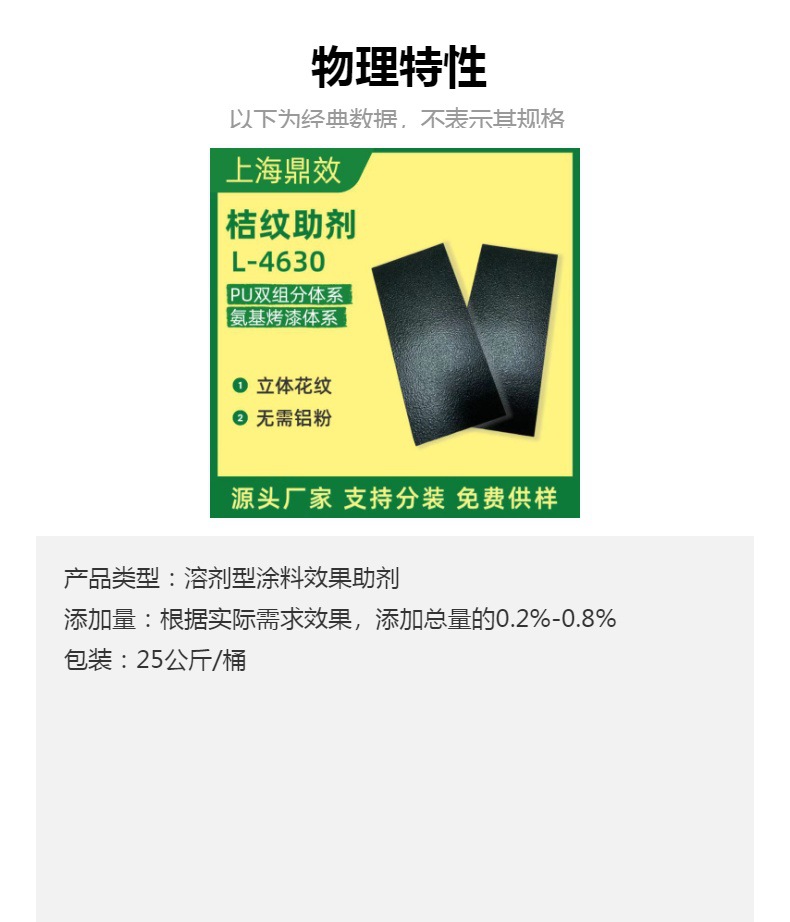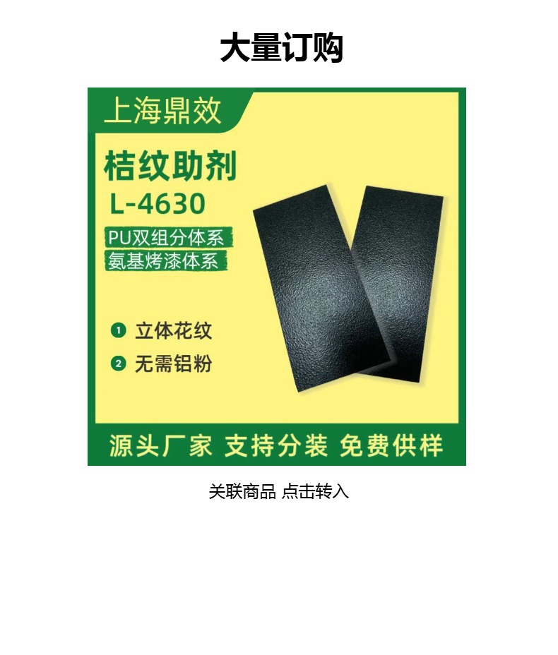L-4630桔纹助剂在溶剂型涂料中能赋予涂料理想的花纹效果,比传统的錘纹助剂能产生更强的立体花纹效果,也无需象錘纹