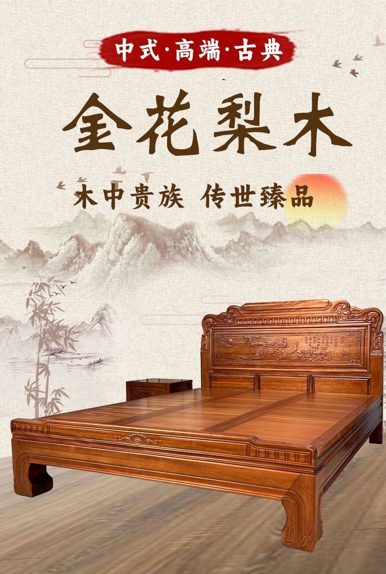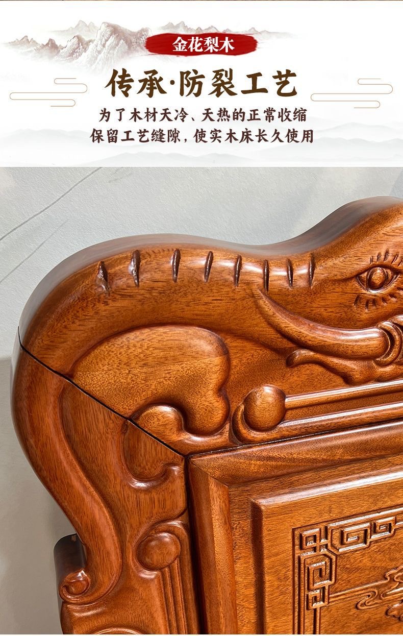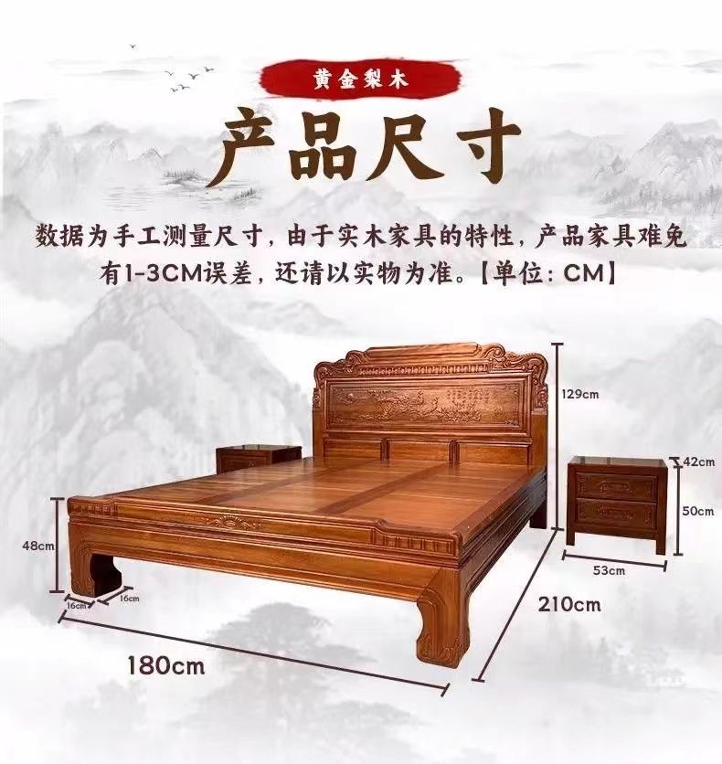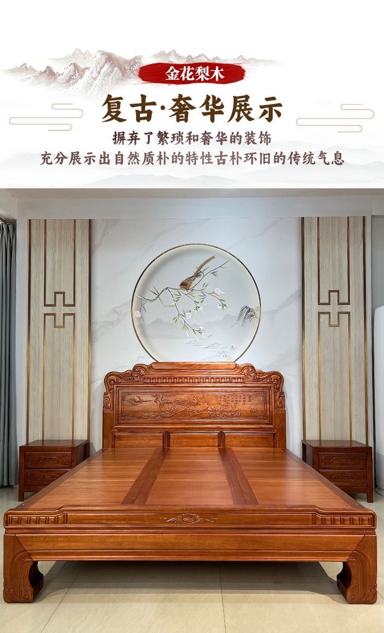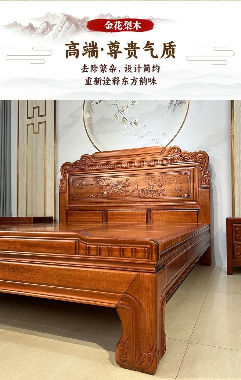 Кровать из золотого розового дерева, двойная кровать 1.8м, антикварная резная кровать