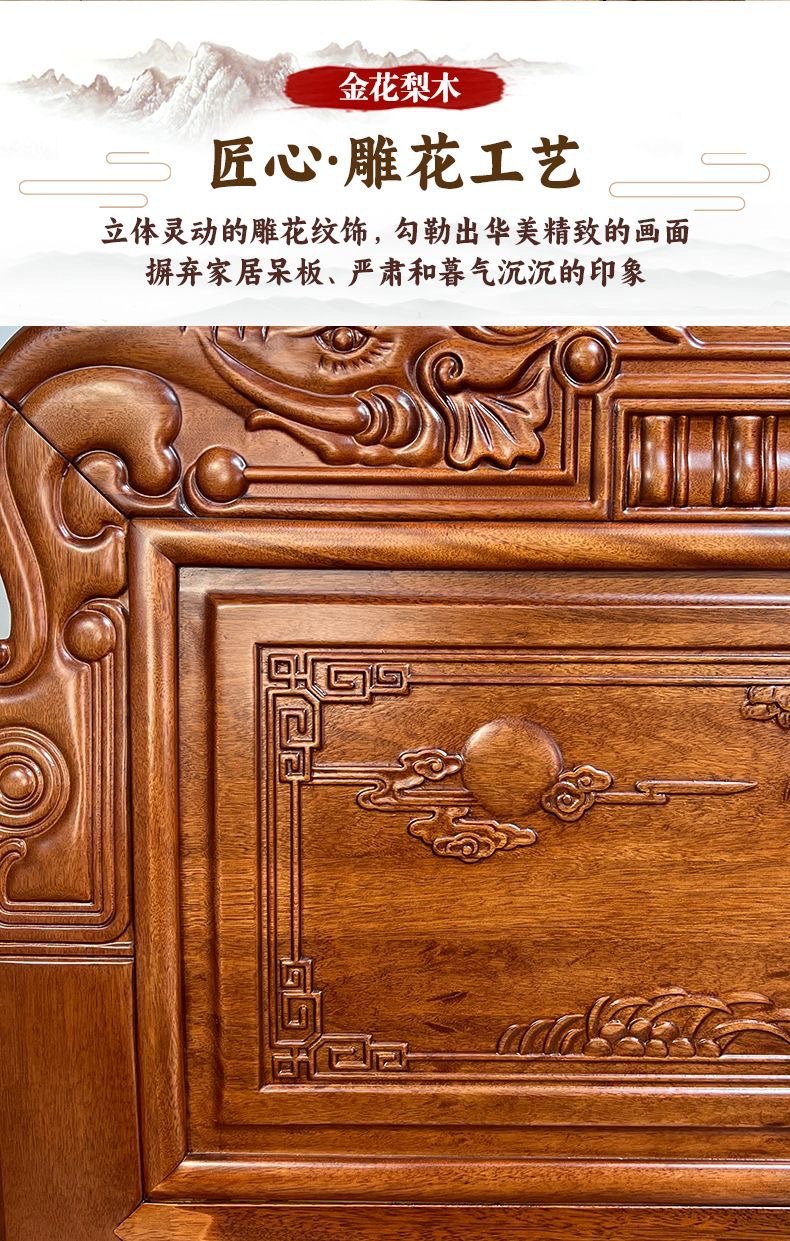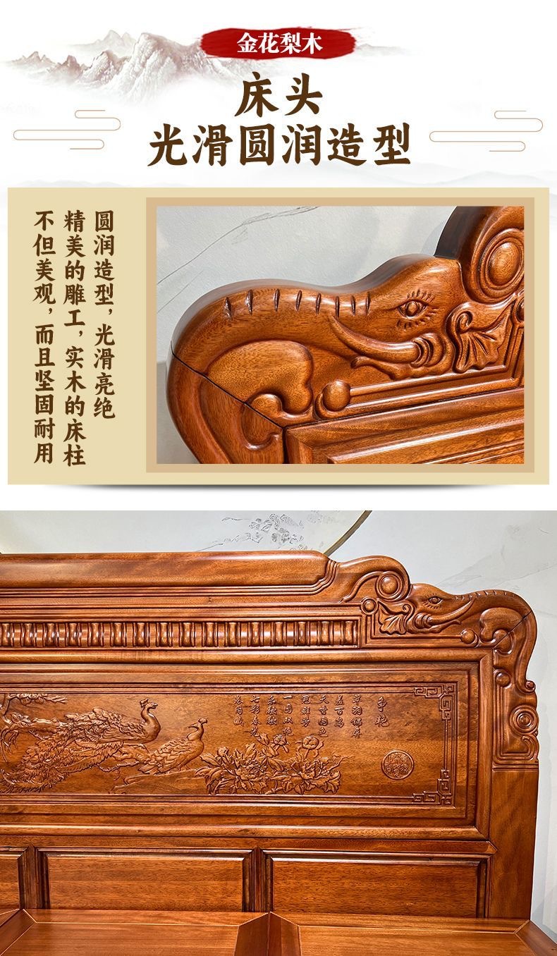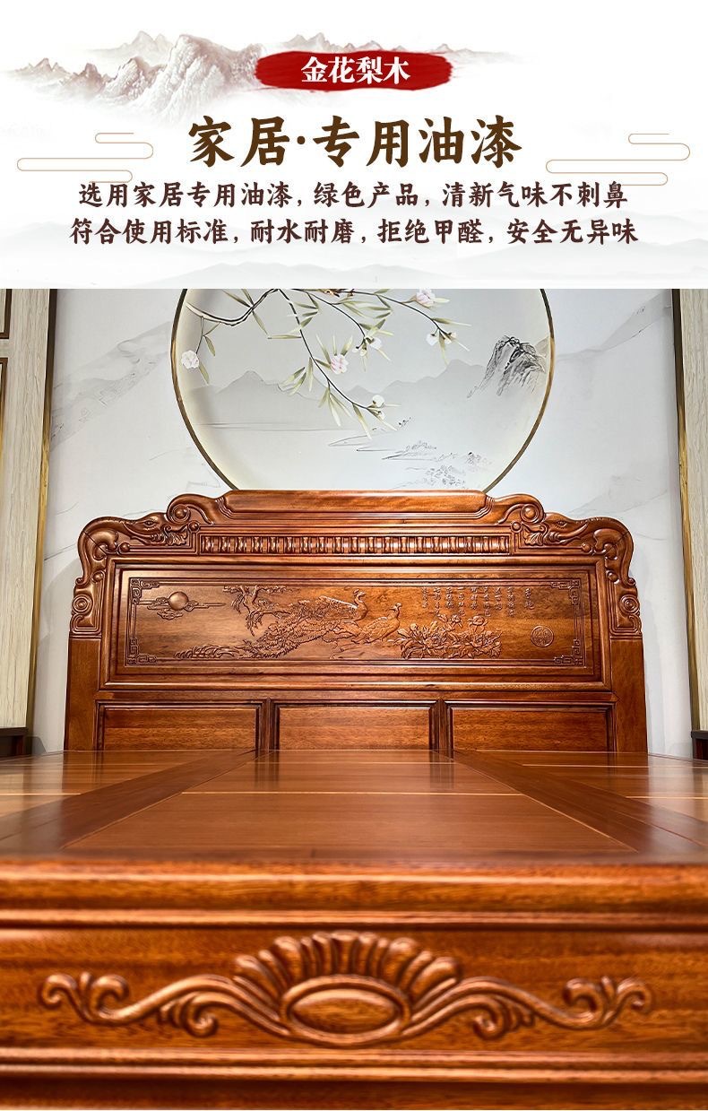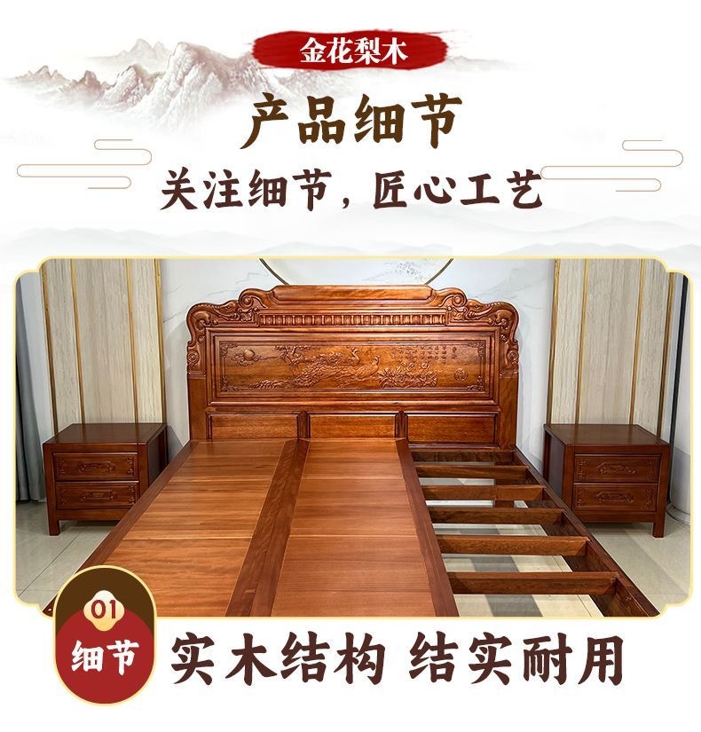 Кровать из золотого розового дерева, двойная кровать 1.8м, антикварная резная кровать