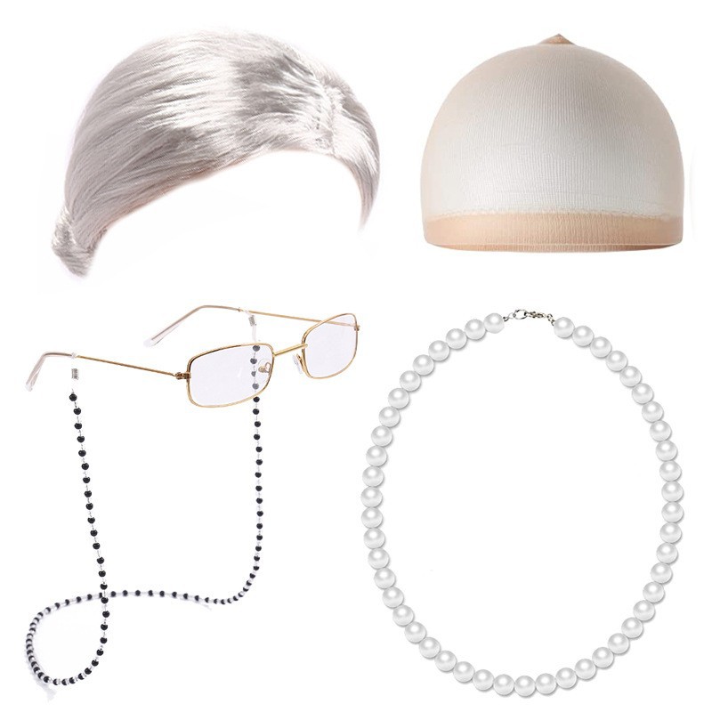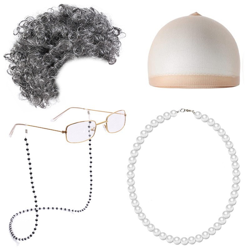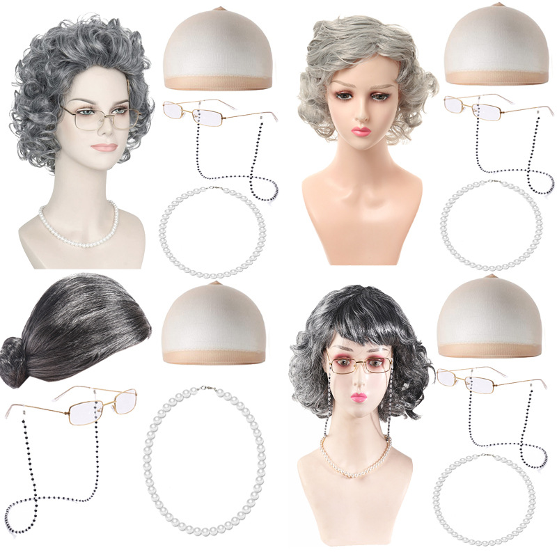 Парик для Хэллоуина для пожилой женщины с короткими кудрями и боковыми челками