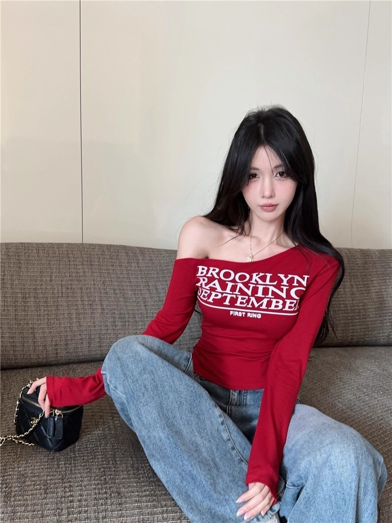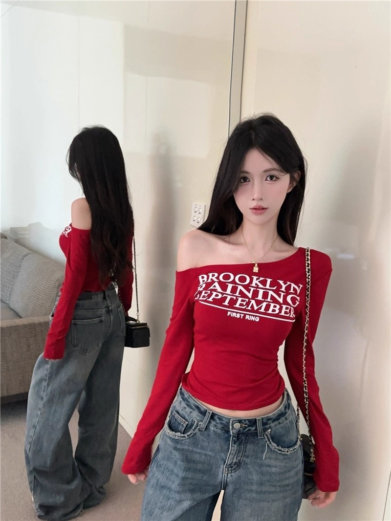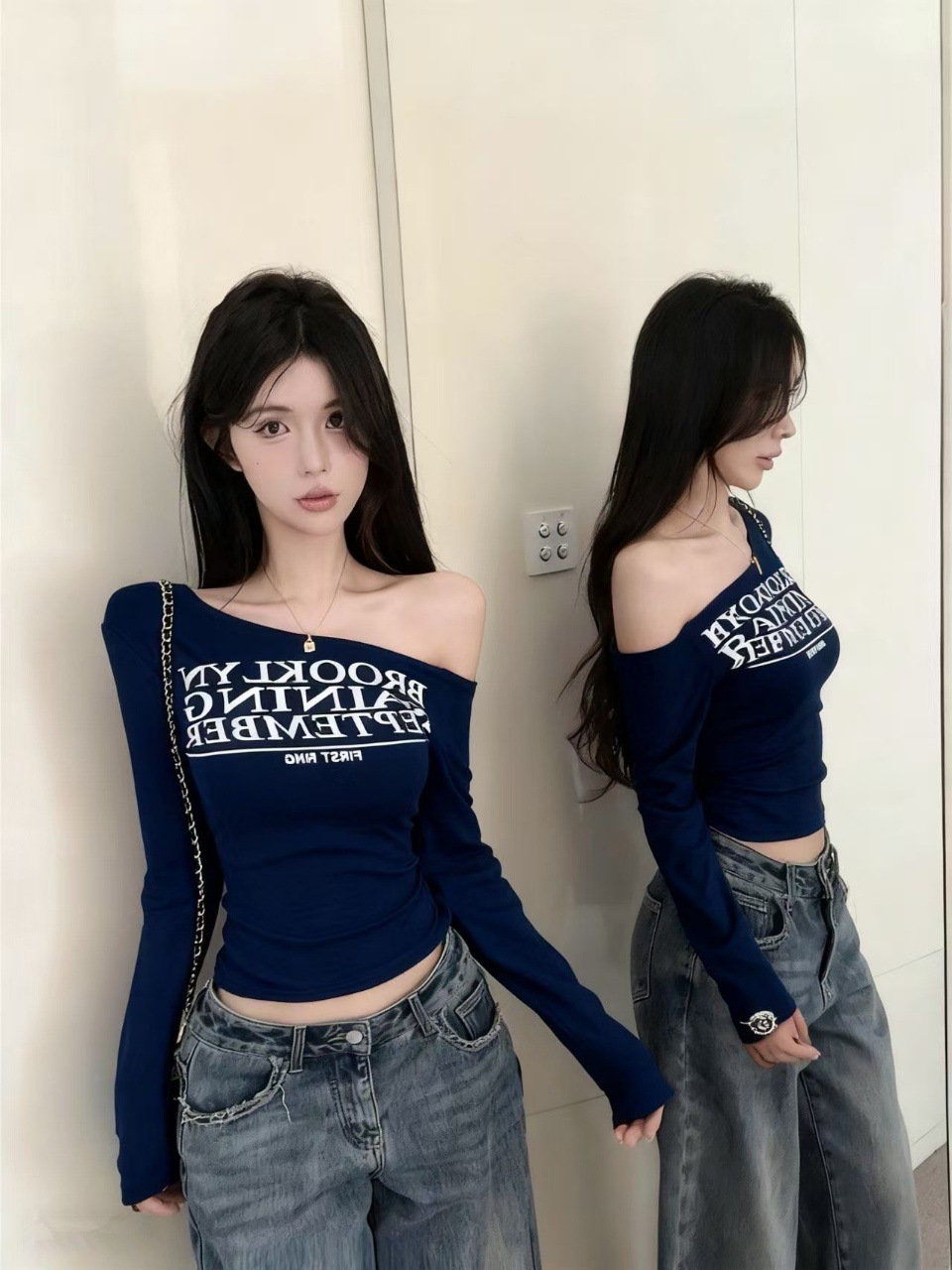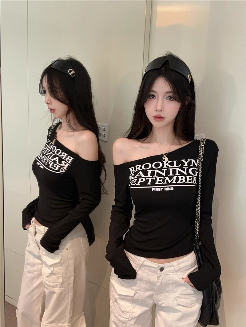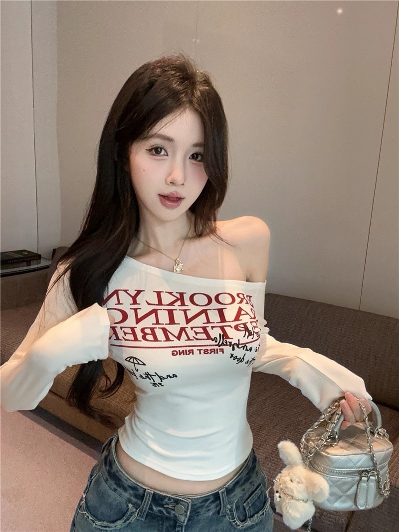 5175 # американская сексуальная футболка с открытыми плечами длинный рукав для женщин с облегающей внутренней посадкой и узким поясом и вставкой для груди