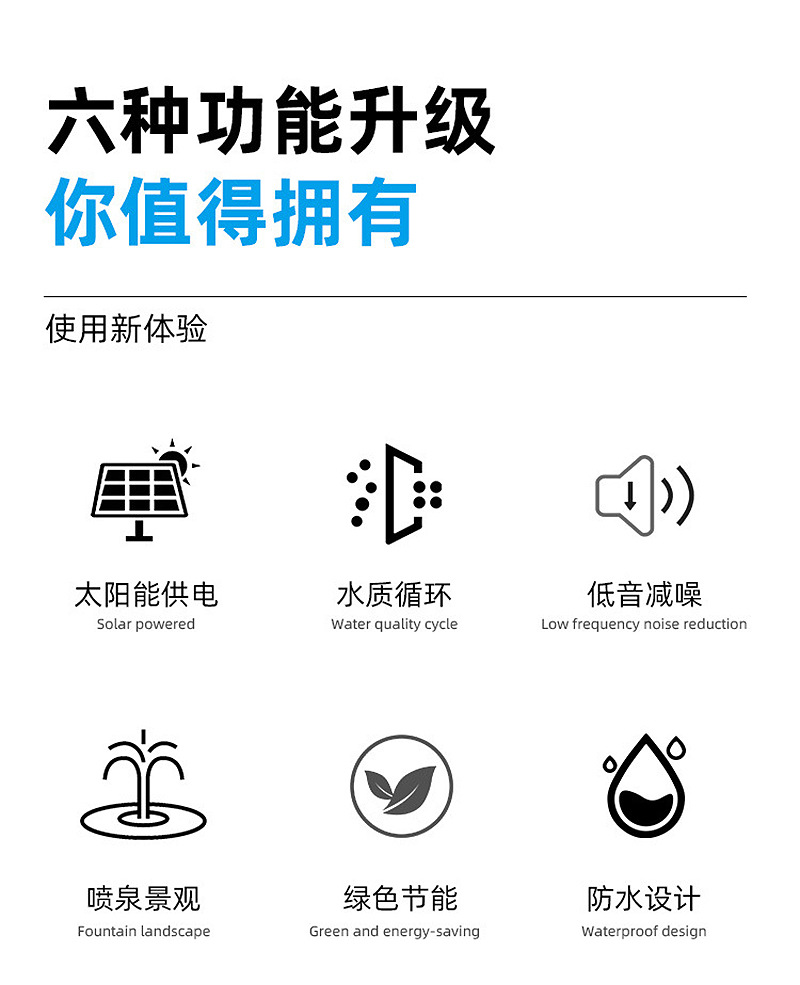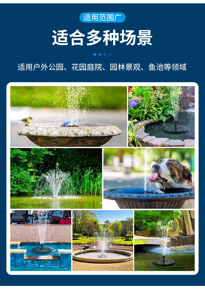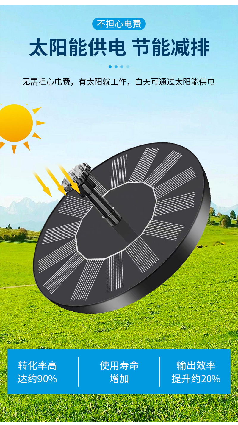 太阳能喷泉是利用太阳能驱动水泵抽水的景观性喷泉装置。本产品采用高效太阳能电池板以及新型无刷水泵,具有启动快、效率高、稳定性强的优点。此外,产品漂浮在水面上,无需外接电源,安装方便、操作简单。广泛应用于适用于花园装饰、鸟澡盆、小池塘水体循环增氧、假山喷泉等场所。安装简单,使用方便,只要有直射阳光,水泵就能启动工作。