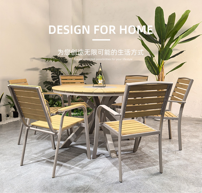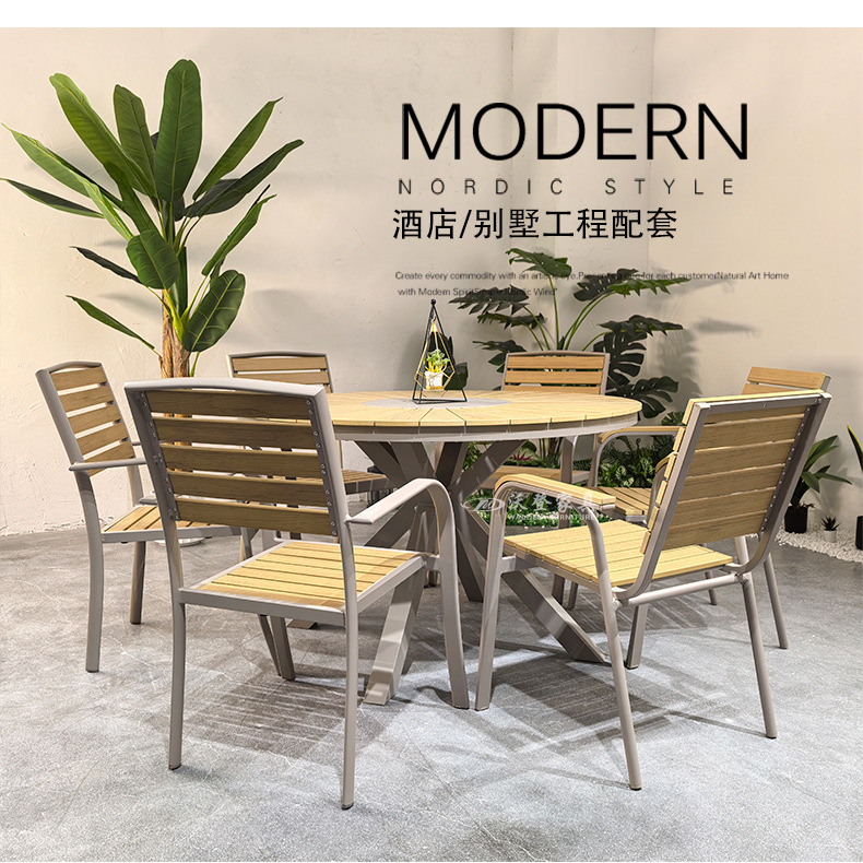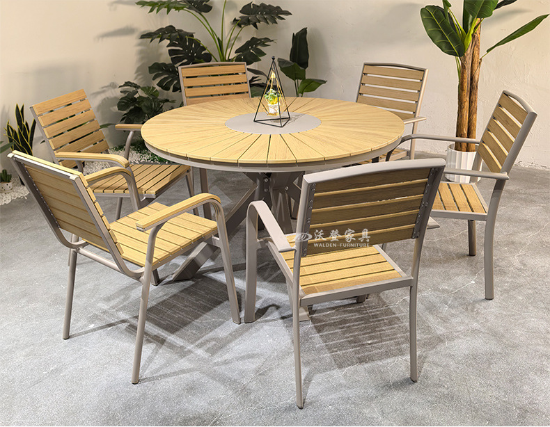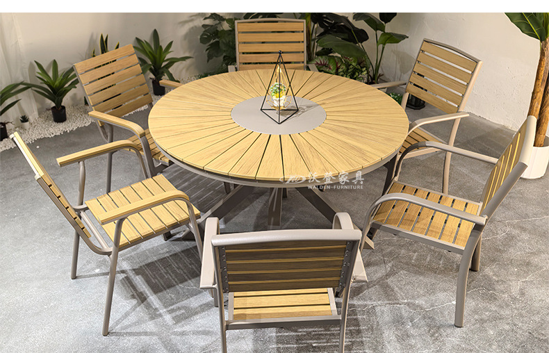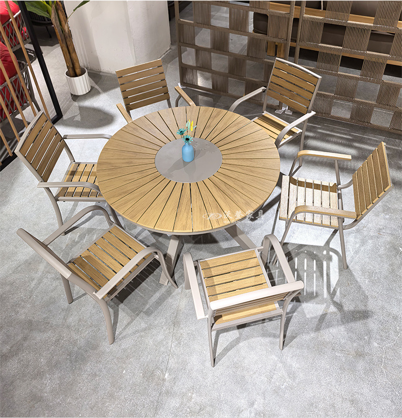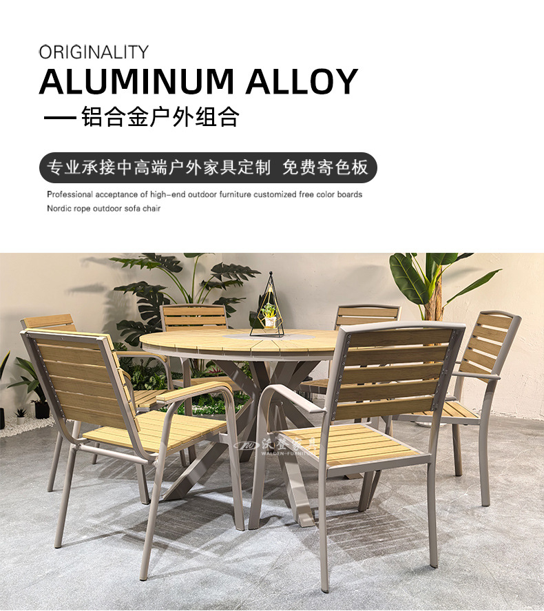 Круглый стол и стулья из алюминиевого сплава и пластика, уличный двор, водонепроницаемые, защищающие от солнца, имитация дерева