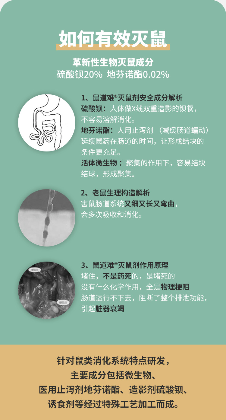 Функция Rat extermination and rat removal are developed based on the characteristics of the digestive system of rats. through the action of microorganisms, it physically promotes intestinal obstruction in rats and causes organ failure and death.