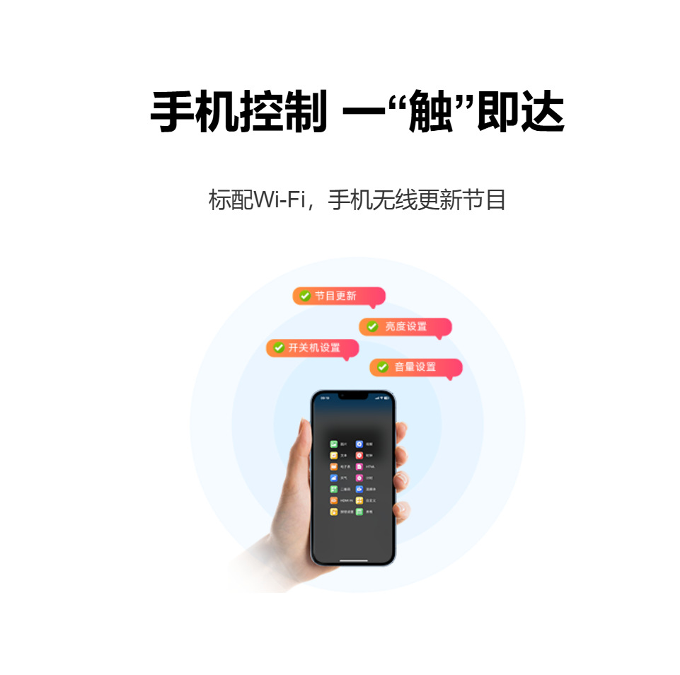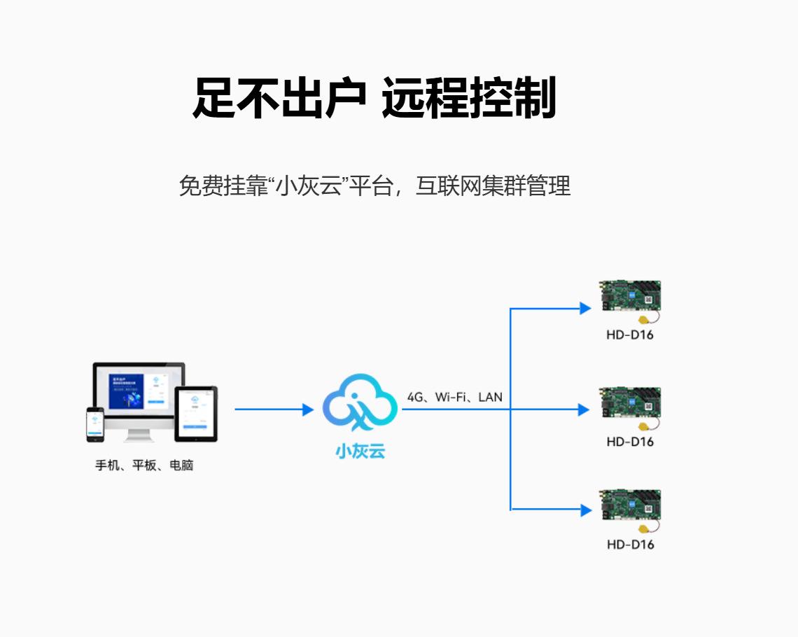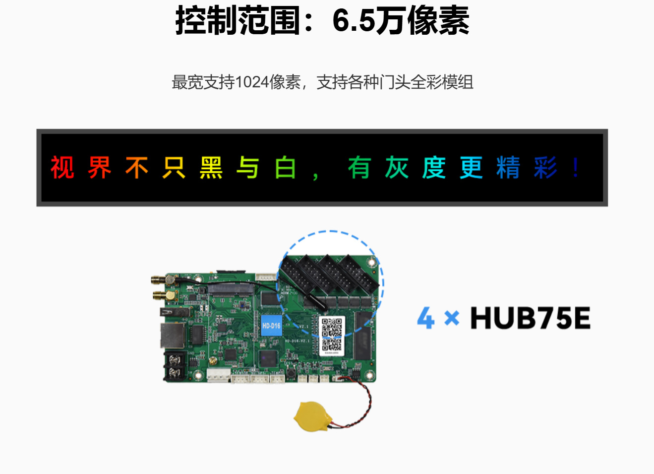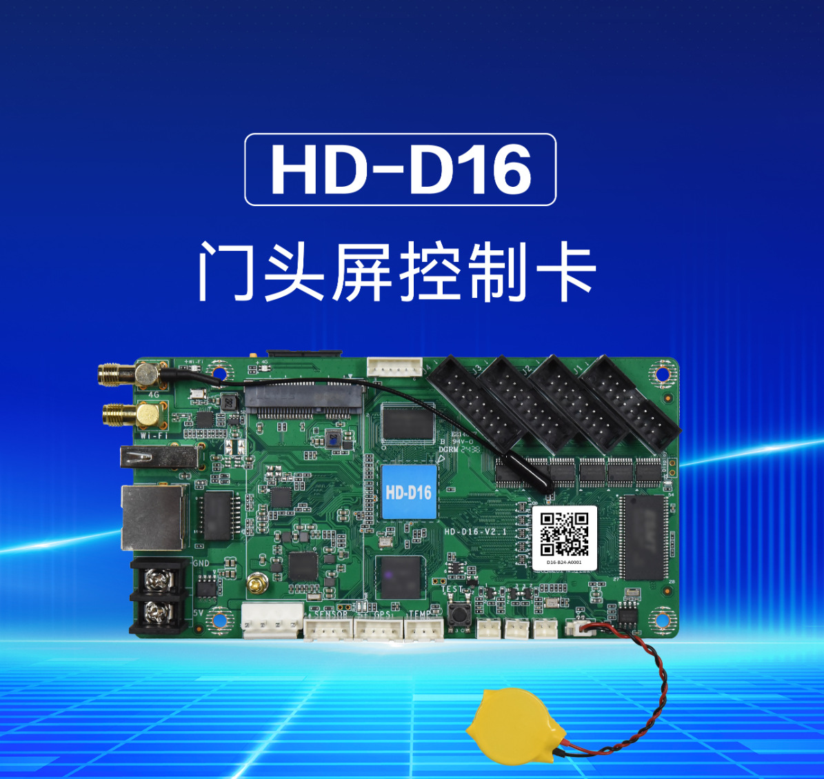 HD-D16 是一款针对门头屏、车载屏和全彩小屏而推出的LED显示屏控制卡,板载4个标准HUB75E接口, 标配Wi-Fi——“屏掌控”无线控制;支持接入“小灰云”平台,轻松实现互联网远程集群管理;支持USB接口更新 播放节目;支持外接各种环境监测传感器;支持播放视频、图片、Gif动画、文本、WPS文档、表格、时钟、计时 等多种节目内容;支持 60Hz 帧频输出。