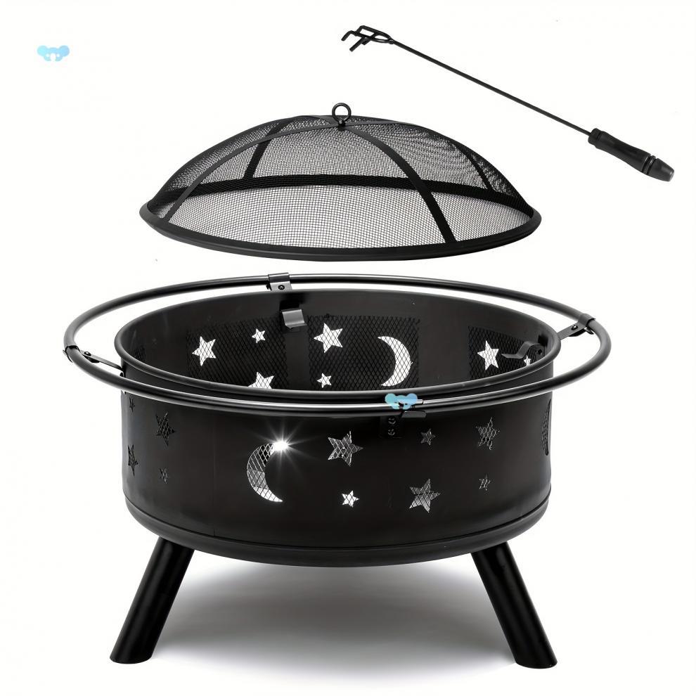Круглый черный металлический костровой очаг 30 с вырезами звезды и луны