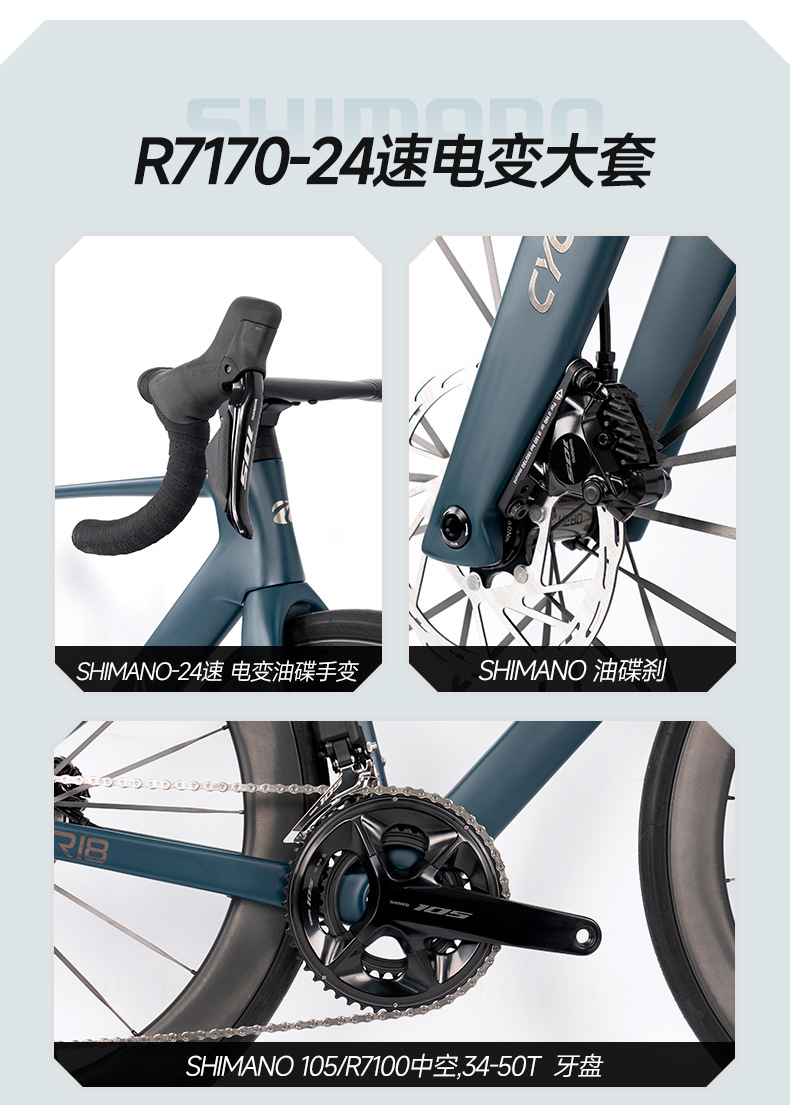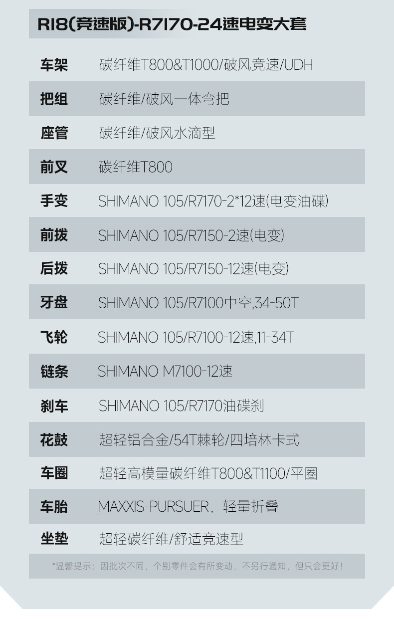 【变速】:SHIMANO 105/R7170-2*12速(电变油碟)