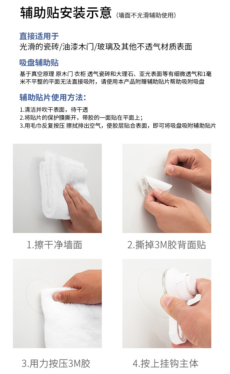 鉴于部分瓷砖达不到理想光滑平整,或是不易发现细微缝隙,导致吸盘不能吸附或吸附能力不强,建议搭配双面辅助贴(需另购)一起使用,安装更牢固更强劲…双面辅助贴适用于大部分墙面…