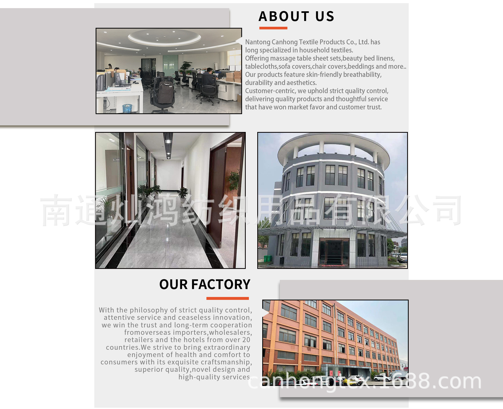 南通灿鸿纺织用品有限公司专业生产按摩床单套件、美容床罩、床品套件、床垫套、桌布餐巾、沙发套、酒店布草等。产品丰富、品质优良、价格优惠,产品畅销于海内外市场,欢迎来电咨询详谈!