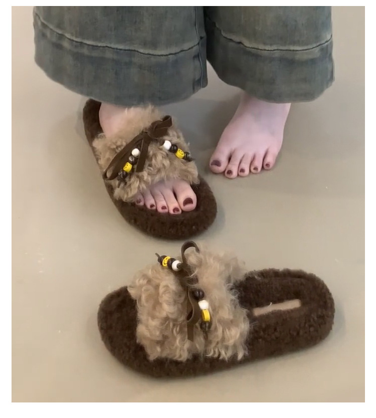 Толстые меховые тапочки для женщин с бантиками и бусинами, ретро флисовые, для улицы, удобные однослойные хлопковые тапочки