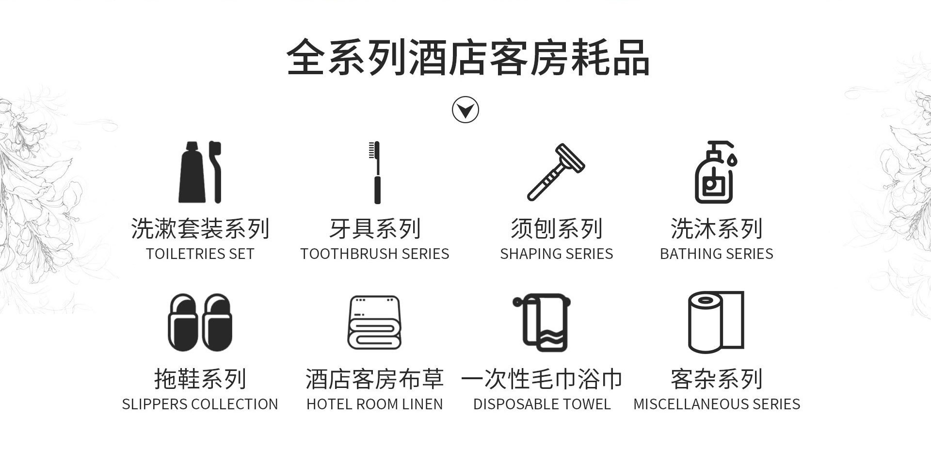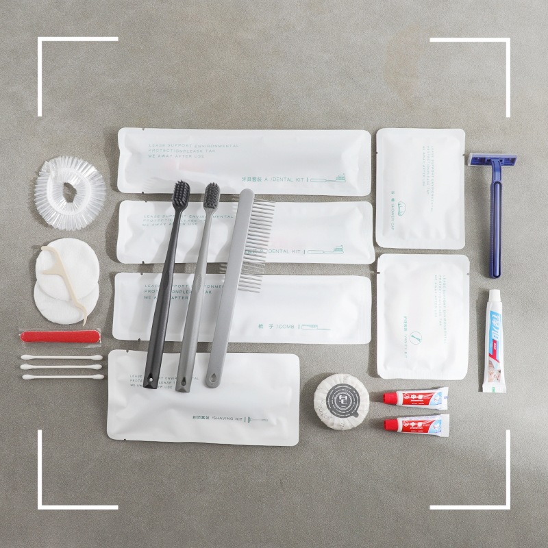 Комплект товаров Disposable slippers, Disposable shower cap, Disposable soap, Disposable razor, Disposable toothbrush, Disposable shower gel, Disposable comb, Disposable shampoo, Disposable toothpaste, Disposable shaving cream, Disposable hair conditioner, Disposable body lotion