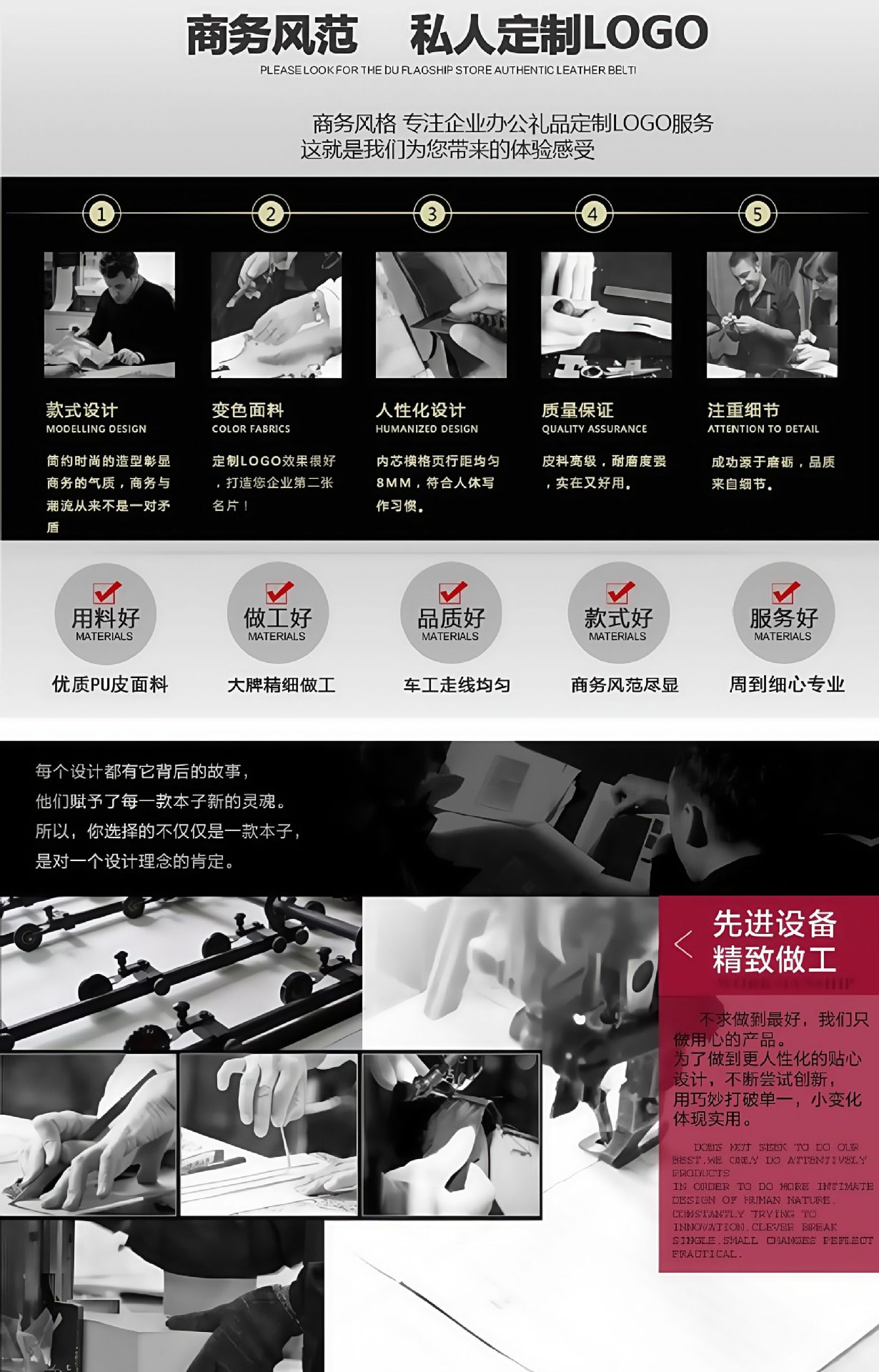 (4)产品可以将贵公司的LOGO或相关文字资料以烫金、烙印、印刷、刺绣等方式表现在产品上,也可订做金属标牌开模、产品内页可以加插广告图文、开版印刷等。