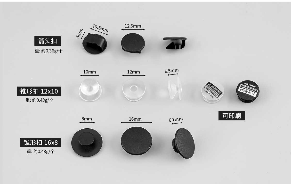 材质: PVC软胶 工字扣 塑料 尼龙 ABS 树脂 EVA塑料 滴塑 环保工字扣 黑色印图案 透明锥形
