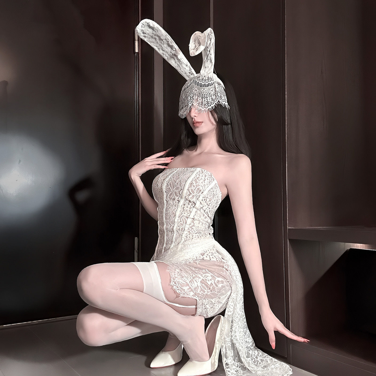 Кружевное платье без бретелей для горячей девушки с косточками, облегающее, сексуальное короткое платье, новый головной убор с ушками кролика для Хэллоуина