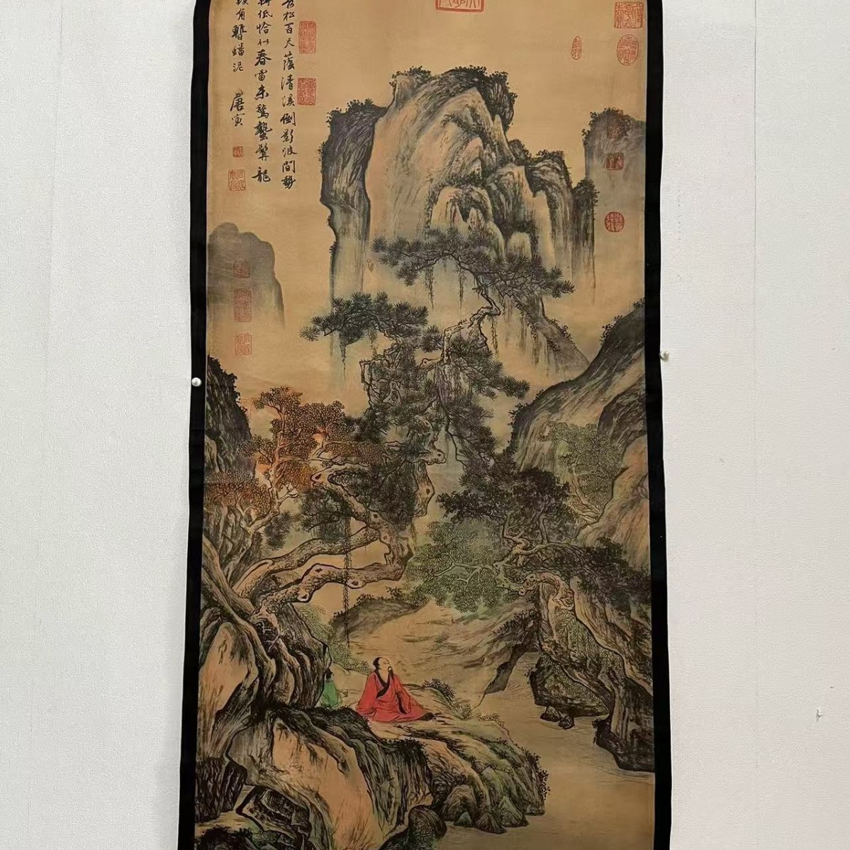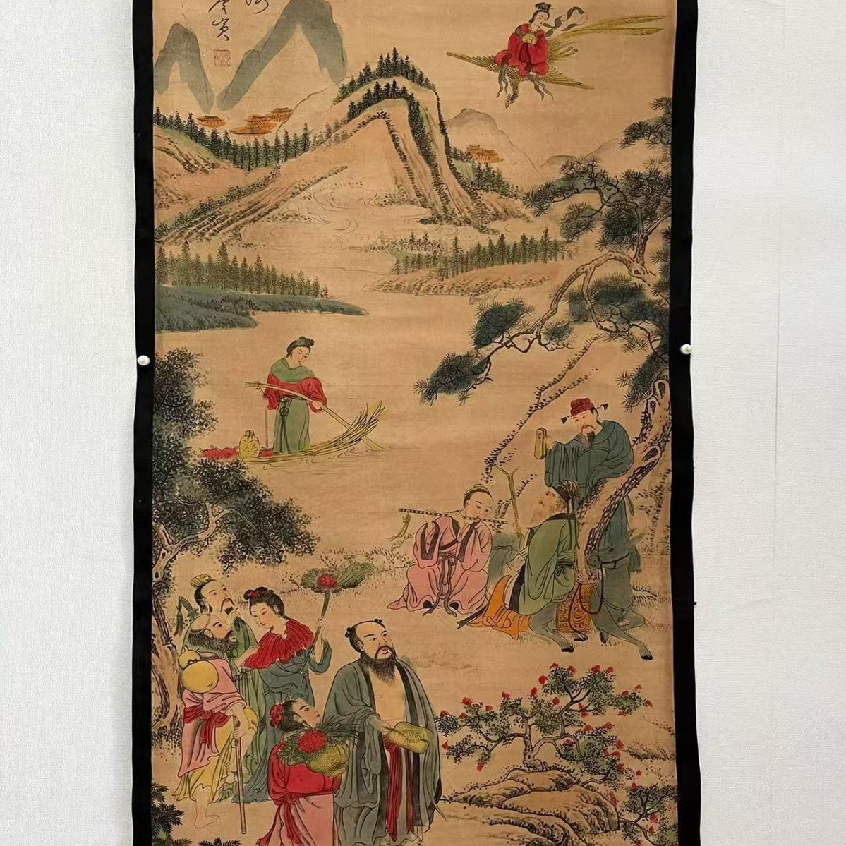 Антикварные оптовые старые украшения для гостиной центральная картина каллиграфия и живопись Тан Ина пейзажи цветы и птицы восемь бессмертных пересекающих море висячая картина