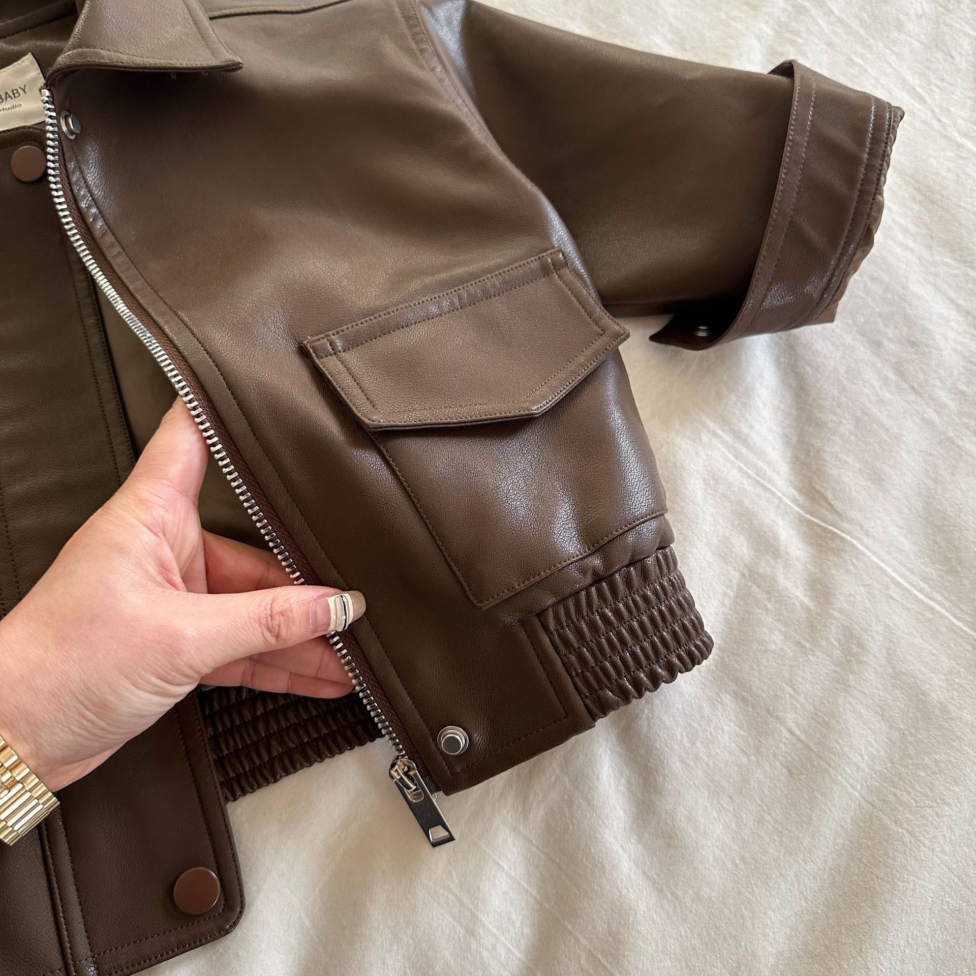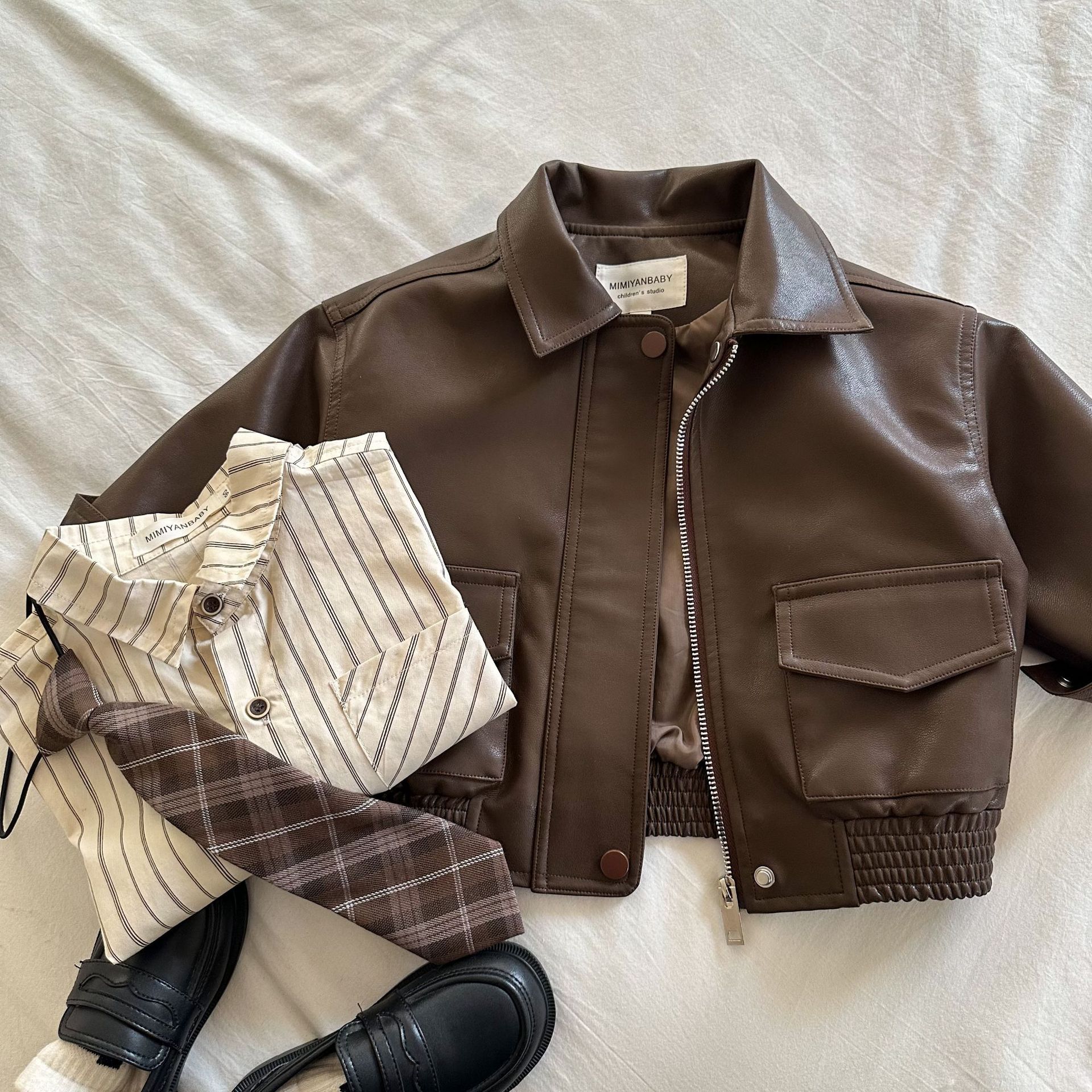 Детская верхняя одежда 2024 Весна Новый продукт Однотонная кожаная куртка с лацканами для мальчиков и девочек Короткая верхняя одежда для младенцев Трендовая
