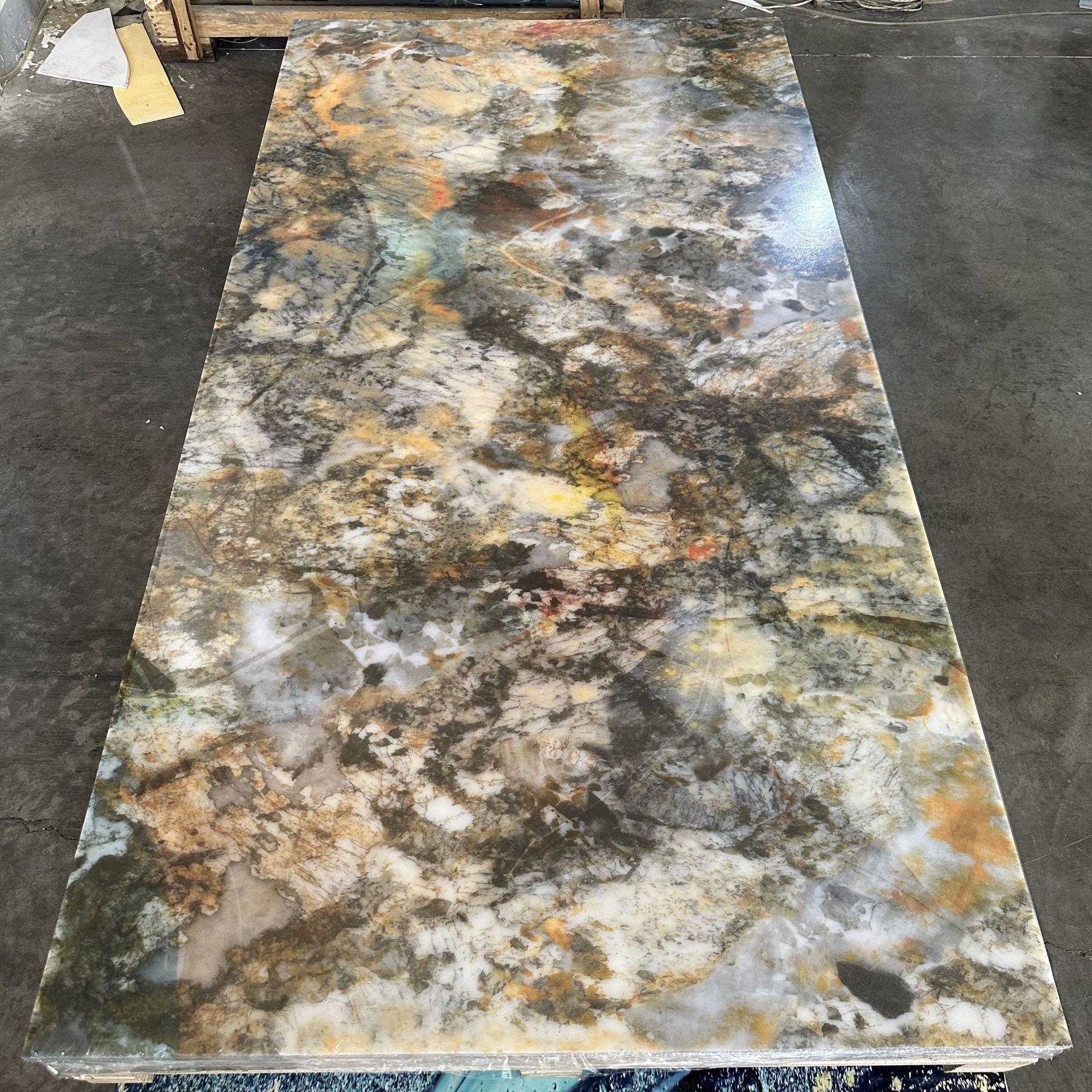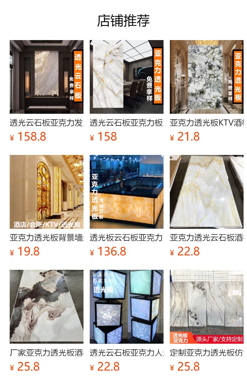 厂家定制:亚克力透光板/背景墙发光云石板/酒店会所商场/酒吧柜台灯箱人造石板等(根据产品数量来报价)常规尺寸:1220*2440*5MM 欢迎外贸、酒店、工程洽谈合作!