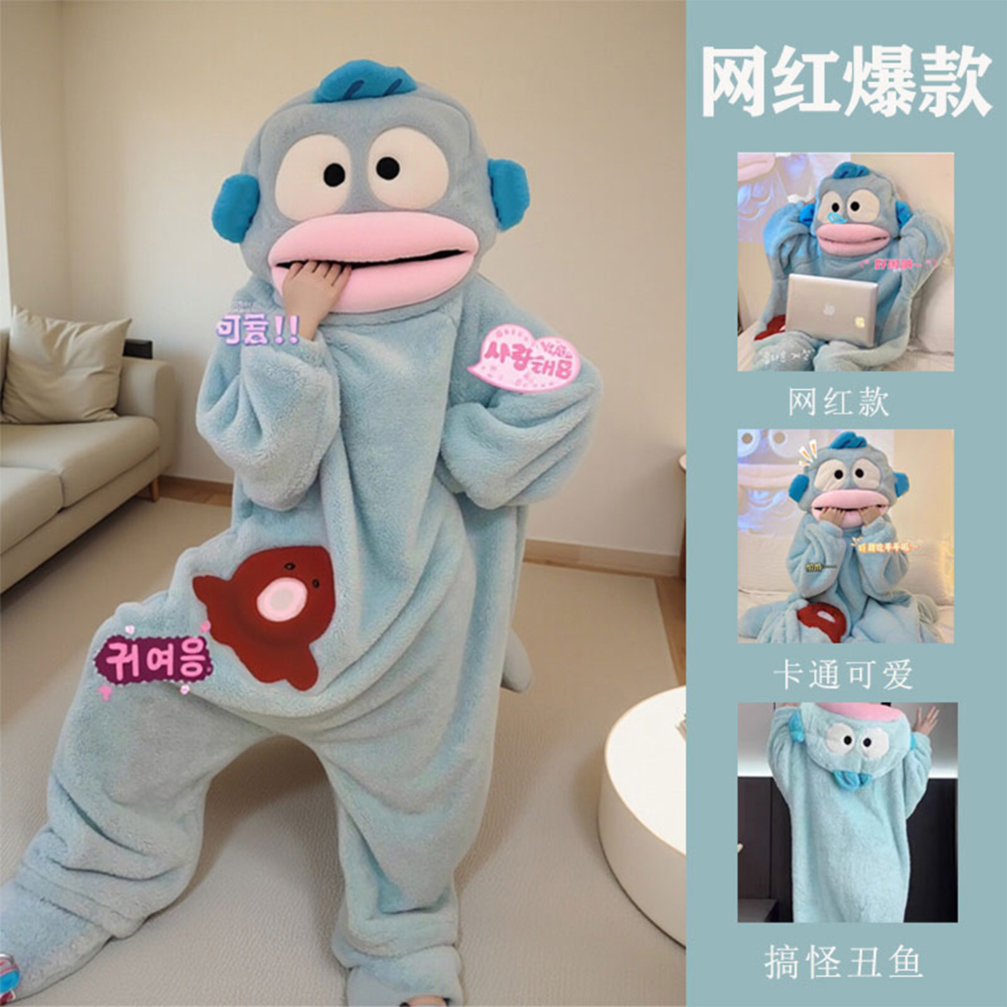 Пижама клоунская рыба большой рот осень и зима детская мультяшная утолщенная смешная мужская и женская коралловая бархатная домашняя одежда, можно носить на улице