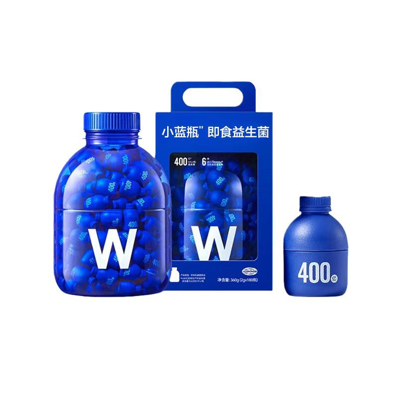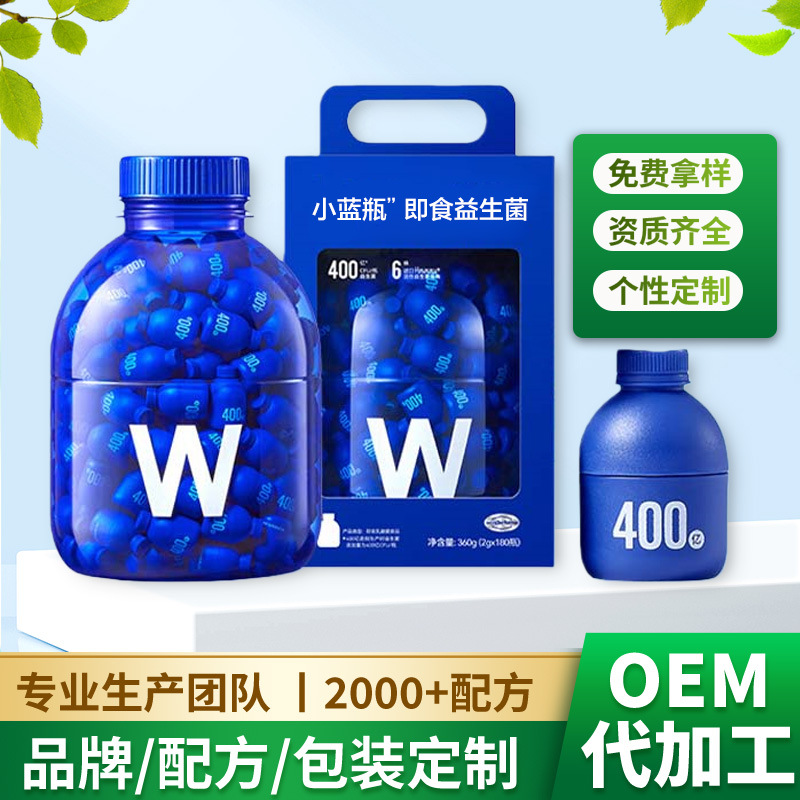Готовый к употреблению активный пробиотический напиток в маленькой синей и зеленой бутылке, замороженный порошок с ферментами